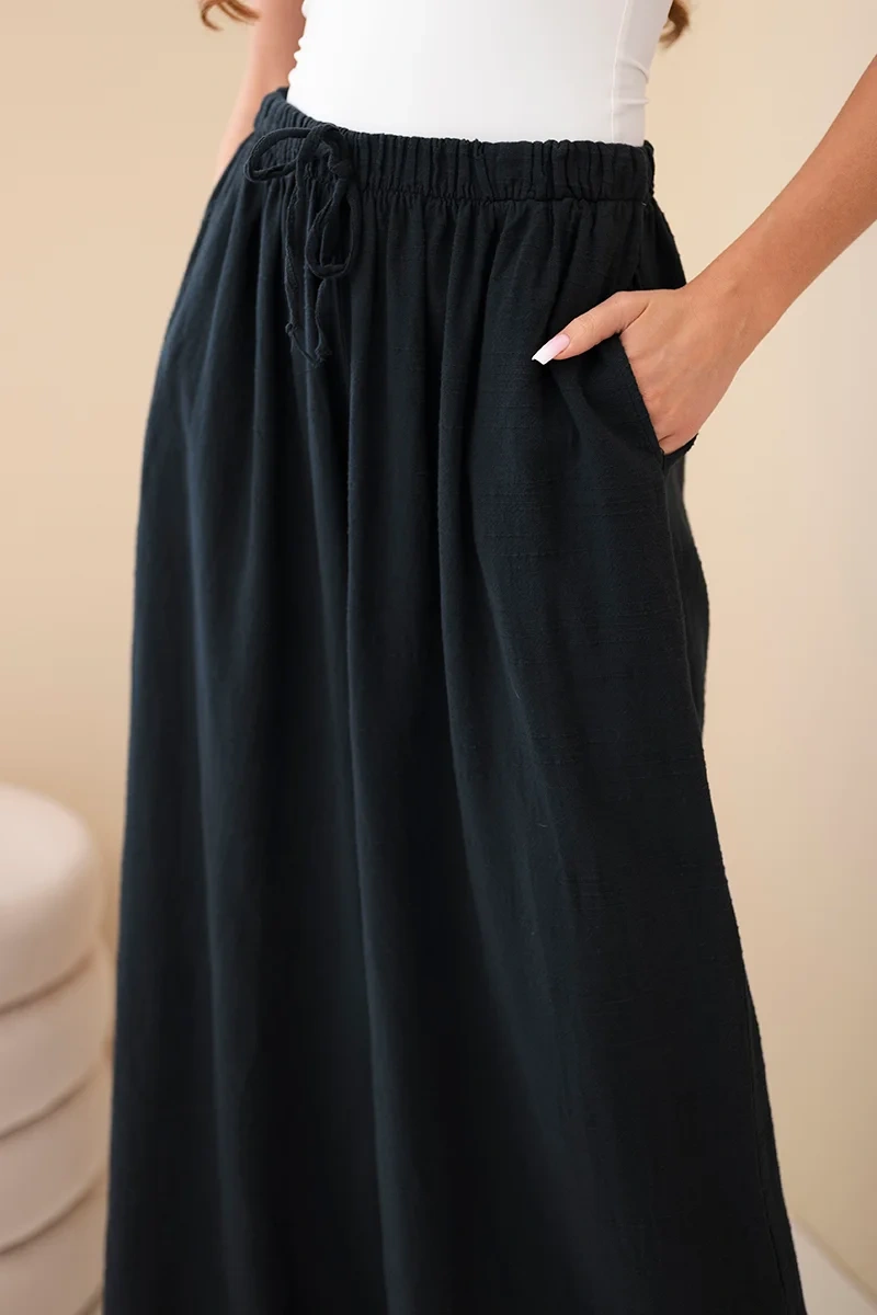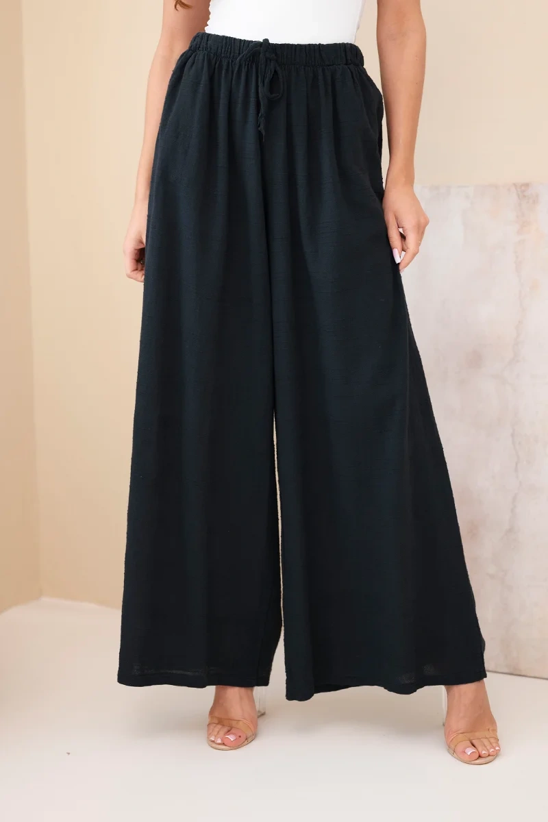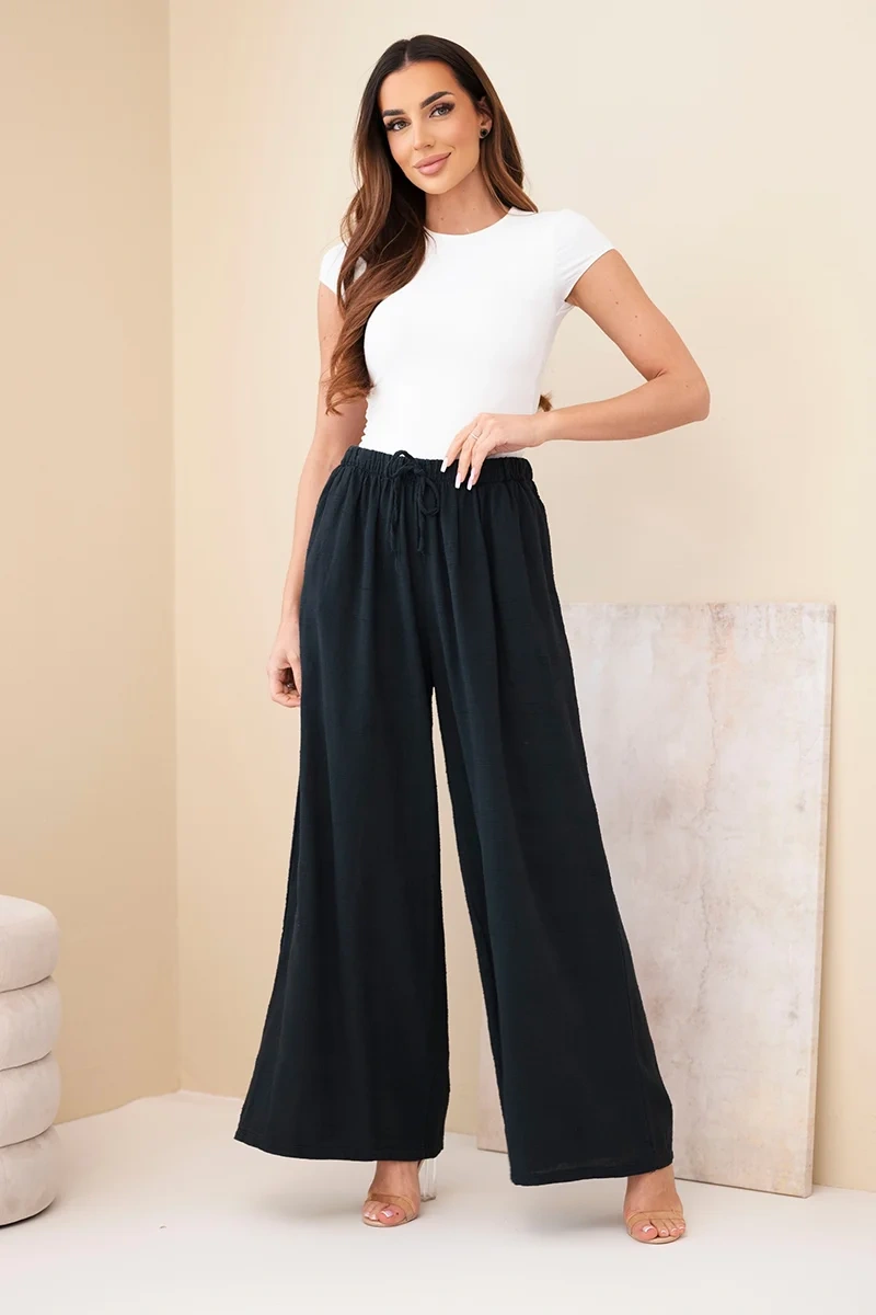 Spodnie damskie szerokie bawełniane z gumką w pasie czarne Lekkie i wygodne spodnie damskie o szerokim kroju to idealna propozycja na ciepłe dni. Model wykonany w 100% z naturalnej bawełny zapewnia komfort noszenia, przewiewność oraz swobodę ruchów przez cały dzień. Luźny fason z szeroką nogawką sprawia, że spodnie prezentują się bardzo stylowo, a jednocześnie są niezwykle wygodne.