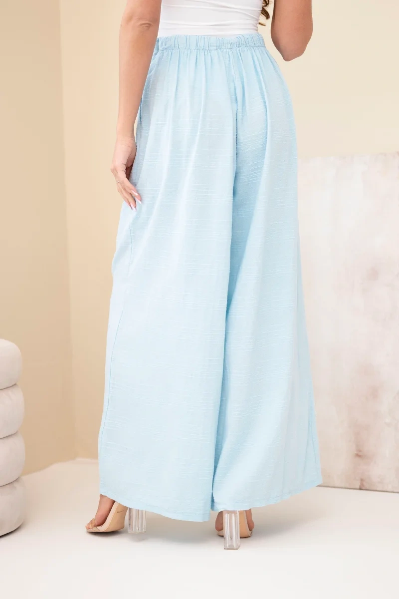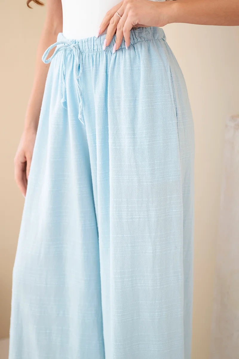 Spodnie damskie szerokie bawełniane z gumką w pasie niebieskie Lekkie i wygodne spodnie damskie o szerokim kroju to idealna propozycja na ciepłe dni. Model wykonany w 100% z naturalnej bawełny zapewnia komfort noszenia, przewiewność oraz swobodę ruchów przez cały dzień. Luźny fason z szeroką nogawką sprawia, że spodnie prezentują się bardzo stylowo, a jednocześnie są niezwykle wygodne.