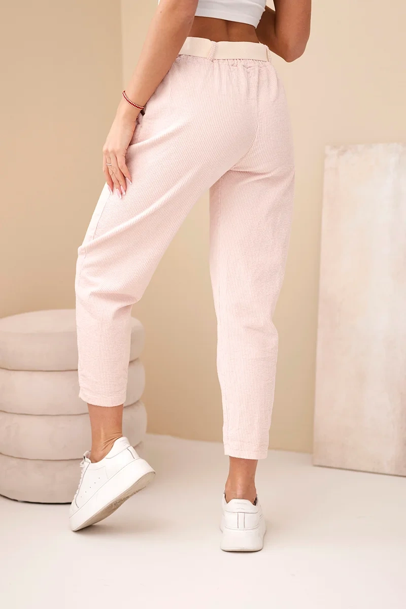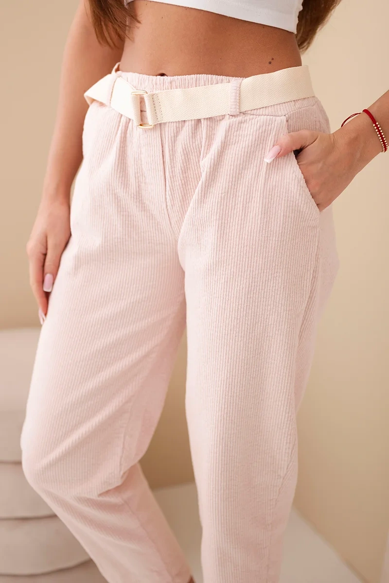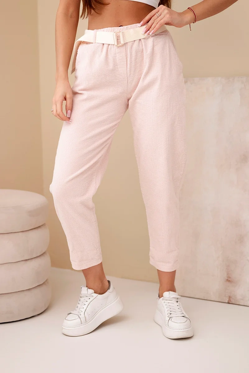 Spodnie damskie sztruksowe z paskiem ciemno pudrowy róż Wygodne i modne spodnie damskie z miękkiego sztruksu to doskonały wybór na chłodniejsze dni. Ich nowoczesny fason ze zwężanymi nogawkami i elastycznym pasem zapewnia idealne dopasowanie do sylwetki oraz wysoki komfort noszenia. Do zestawu dołączony jest materiałowy pasek, który podkreśla talię i dodaje stylowego wykończenia całej stylizacji.
