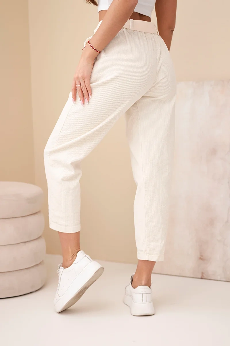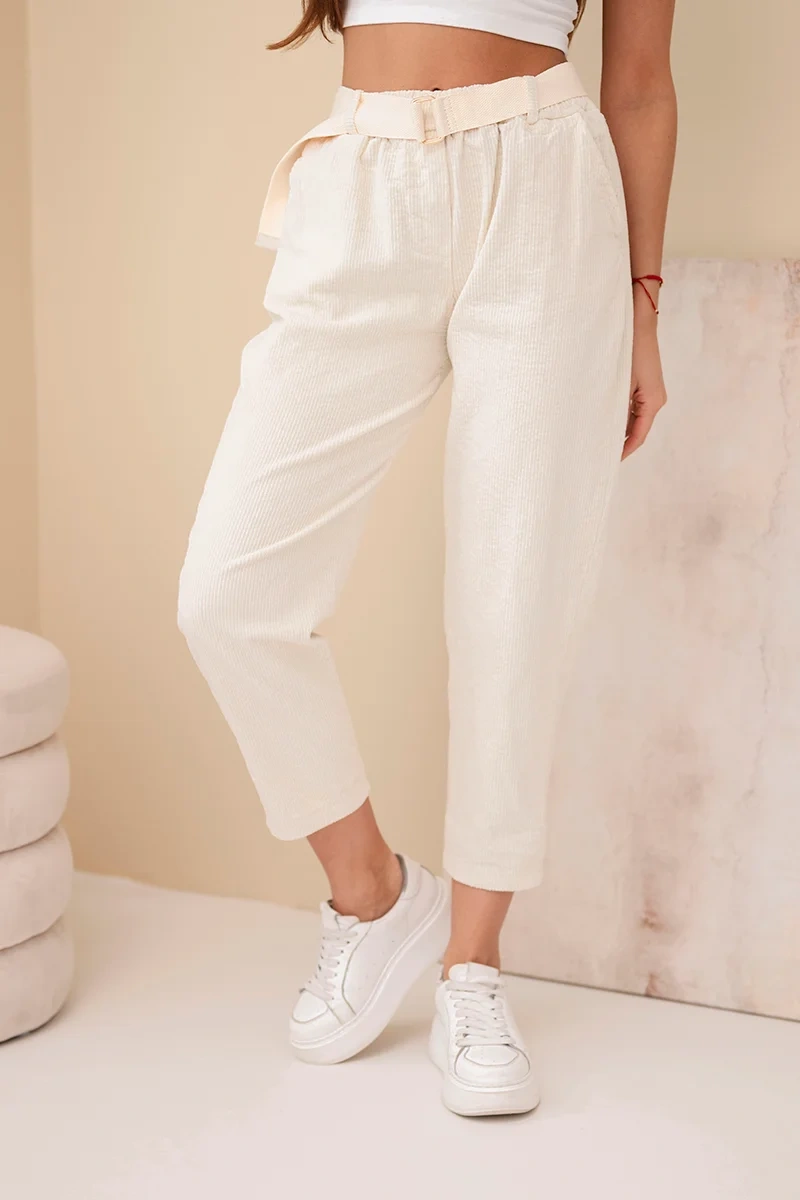 Spodnie damskie sztruksowe z paskiem jasno beżowe Wygodne i modne spodnie damskie z miękkiego sztruksu to doskonały wybór na chłodniejsze dni. Ich nowoczesny fason ze zwężanymi nogawkami i elastycznym pasem zapewnia idealne dopasowanie do sylwetki oraz wysoki komfort noszenia. Do zestawu dołączony jest materiałowy pasek, który podkreśla talię i dodaje stylowego wykończenia całej stylizacji.