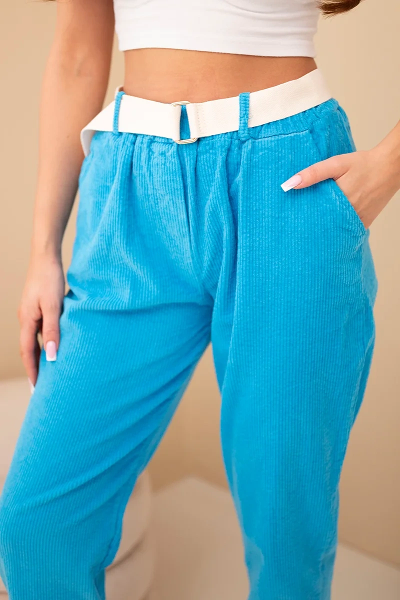 Spodnie damskie sztruksowe z paskiem turkusowe Wygodne i modne spodnie damskie z miękkiego sztruksu to doskonały wybór na chłodniejsze dni. Ich nowoczesny fason ze zwężanymi nogawkami i elastycznym pasem zapewnia idealne dopasowanie do sylwetki oraz wysoki komfort noszenia. Do zestawu dołączony jest materiałowy pasek, który podkreśla talię i dodaje stylowego wykończenia całej stylizacji.
