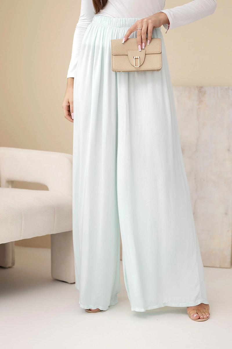 Spodnie damskie wiskozowe szerokie z gumką w pasie miętowe Te wyjątkowe spodnie damskie to połączenie wygody i stylu. Wykonane w 100% z wiskozy, są lekkie, przewiewne i idealnie dopasowują się do sylwetki. Szerokie nogawki nadają im elegancki, zwiewny wygląd, który świetnie sprawdzi się zarówno na co dzień, jak i na wyjątkowe okazje. Dzięki elastycznej gumce w pasie zapewniają komfort noszenia i swobodę ruchów. Możesz je zestawić z elegancką bluzką lub luźnym t-shirtem – zawsze będą wyglądać modnie! Rozmiar jest uniwersalny i będzie odpowiedni dla Pań w rozmiarze S, M lub L.