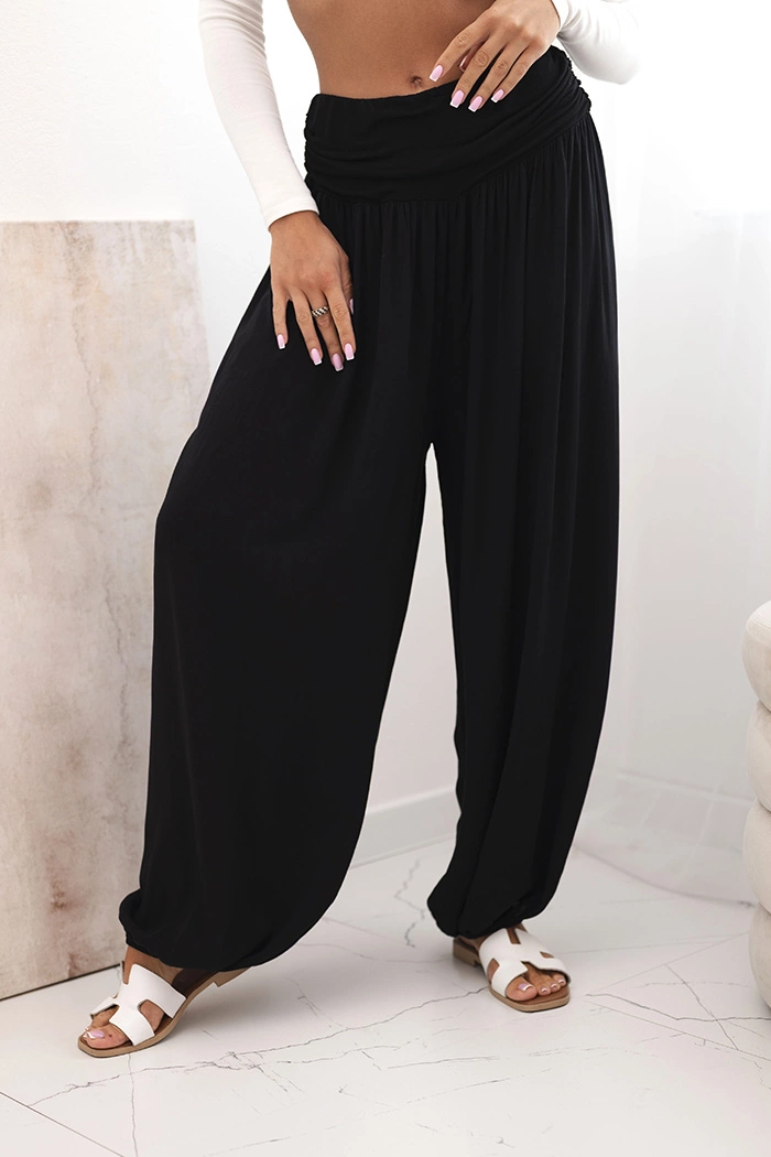 Spodnie damskie wiskozowe z szeroką nogawką i marszczeniami czarne Te wyjątkowe spodnie damskie z szeroką nogawką i subtelnymi marszczeniami to idealna propozycja na co dzień i nie tylko. Wykonane w 100% z miękkiej wiskozy, gwarantują lekkość i przyjemność noszenia nawet w cieplejsze dni. Elastyczny pas zapewnia komfort i doskonałe dopasowanie, a luźny krój daje swobodę ruchów i modny wygląd. Model zakończony gumką u dołu nogawek nadaje spodniom unikalny charakter i delikatnie podkreśla sylwetkę. To świetny wybór na spacer, zakupy, wyjazd czy relaks w domowym zaciszu. Dzięki prostemu fasonowi i neutralnej kolorystyce łatwo dopasujesz je do różnych stylizacji – od sportowych po casualowe. Rozmiar jest uniwersalny i będzie odpowiedni dla Pań w rozmiarze S, M lub L.