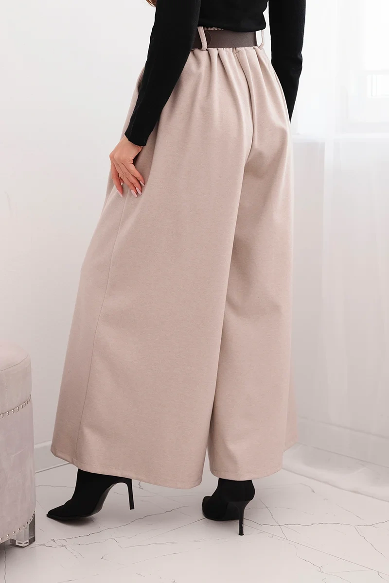 Spodnie damskie z szeroką nogawką i paskiem beżowe Stylowe i ponadczasowe damskie spodnie z szeroką nogawką to idealna propozycja dla kobiet, które cenią sobie wygodę i elegancję w codziennym ubiorze. Wykonane z miękkiego i elastycznego materiału, pięknie układają się na sylwetce, podkreślając kobiece kształty i jednocześnie zapewniając pełen komfort noszenia.