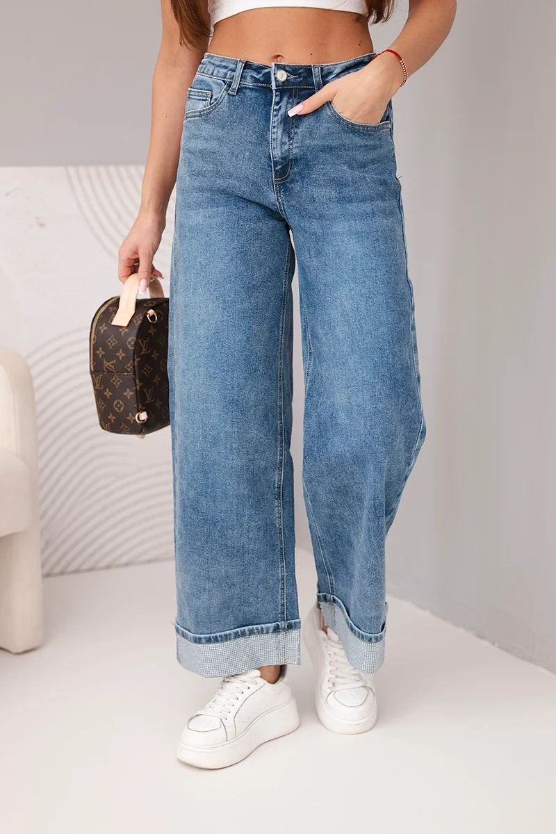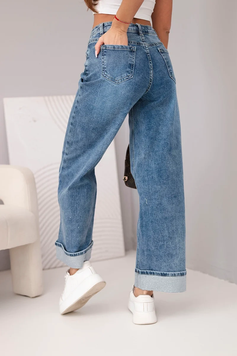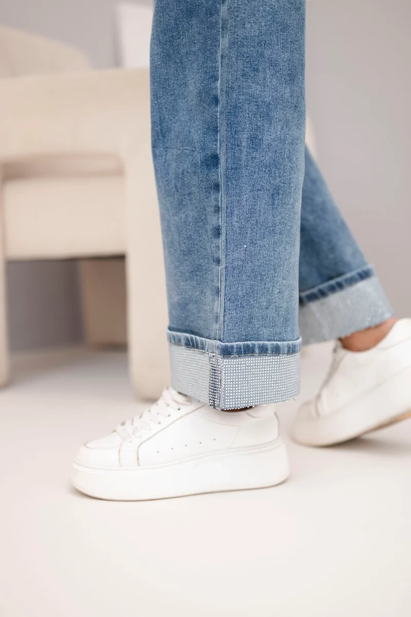 Szukasz jeansów, które wyróżnią Twoją stylizację? Te jeansy damskie z szeroką nogawką i efektownym zdobieniem na dole nogawek to świetny wybór dla kobiet ceniących modny wygląd i wygodę. Subtelny połysk dodaje im wyjątkowego charakteru, a klasyczny, nieco sprany odcień denimu nadaje lekkości i stylu.
