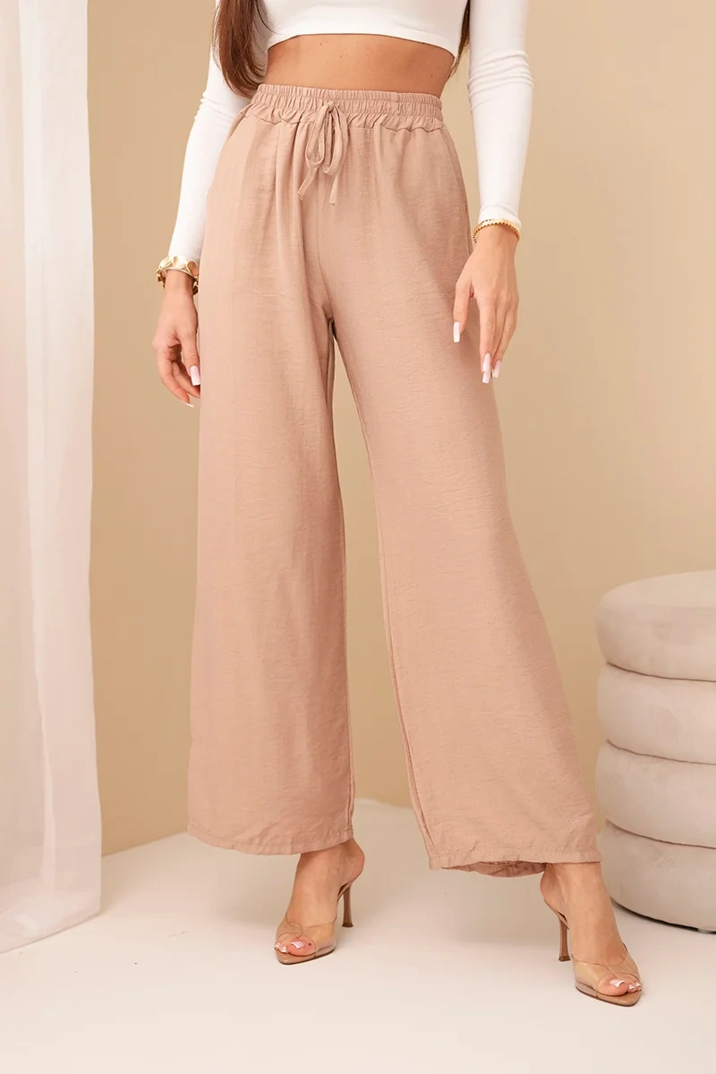 Spodnie z wiskozy z szeroką nogawką camelowe Spodnie z wiskozy z szeroką nogawką to wyjątkowy element garderoby, który łączy w sobie komfort i elegancję. Wykonane z lekkiego i przewiewnego materiału wiskozy, te spodnie gwarantują nie tylko swobodę ruchów, ale także zapewniają uczucie lekkości i świeżości przez cały dzień. Szeroka nogawka nadaje spodniom charakterystyczny, luźny fason, który jest zarówno modny, jak i wygodny. Ten element sprawia, że spodnie prezentują się niezwykle stylowo i efektownie, dodając oryginalności każdej stylizacji. Uniwersalny design spodni z szeroką nogawką sprawia, że doskonale pasują one do różnych okazji i stylizacji. Możesz nosić je zarówno do codziennych, luzackich outfitów, jak i do bardziej eleganckich zestawów na spotkania biznesowe czy wieczorne wyjścia. Spodnie z wiskozy z szeroką nogawką to idealny wybór dla kobiet, które cenią sobie wygodę i styl. Dzięki swojemu uniwersalnemu designowi i wysokiej jakości wykonania, te spodnie stanowią niezastąpiony element garderoby, który świetnie uzupełni każdą kolekcję ubrań. Rozmiar jest uniwersalny i będzie odpowiedni dla Pań noszących rozmiar S, M lub L.