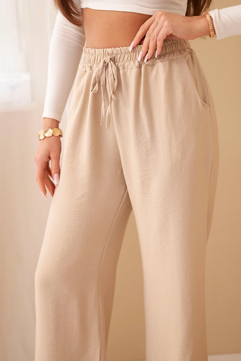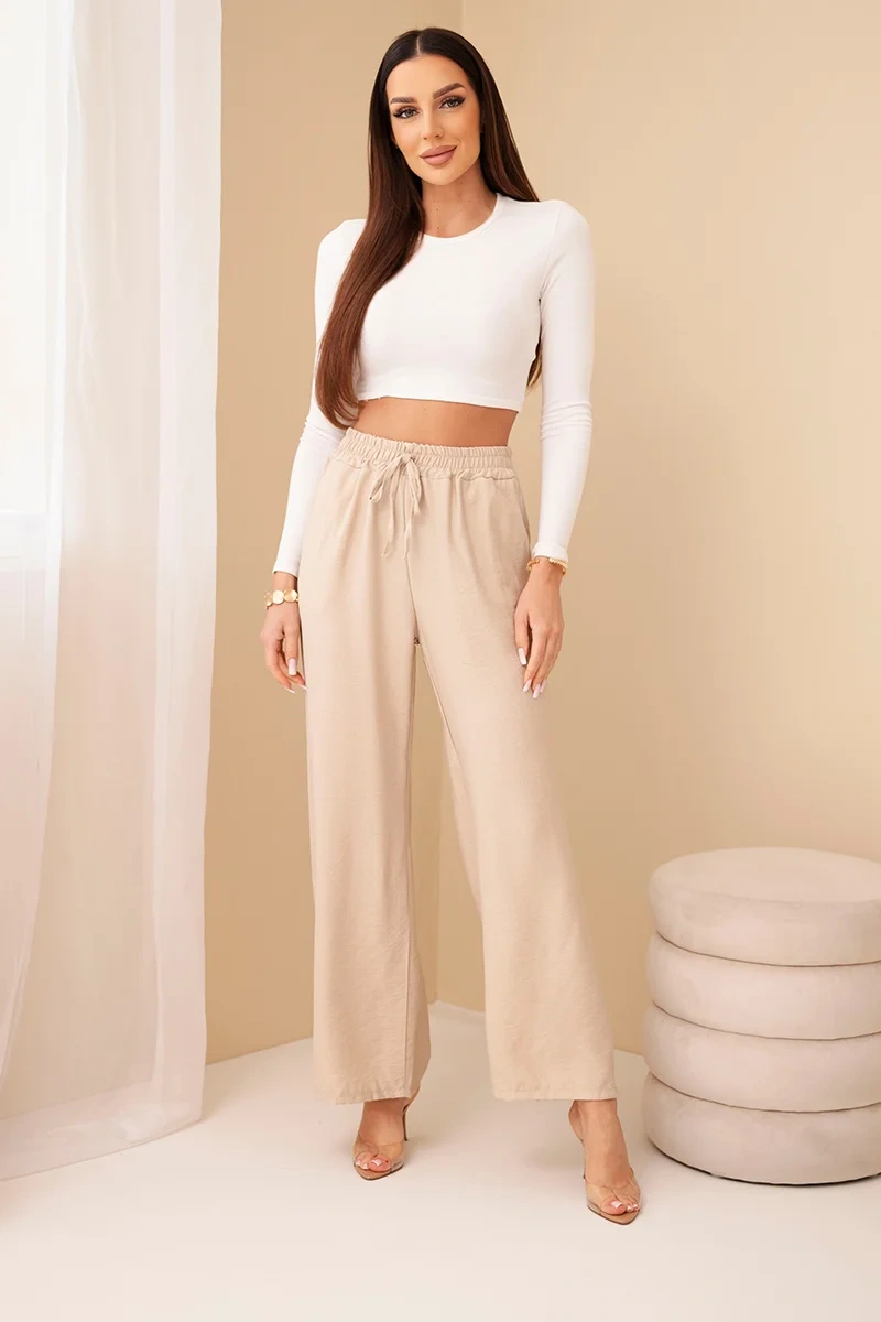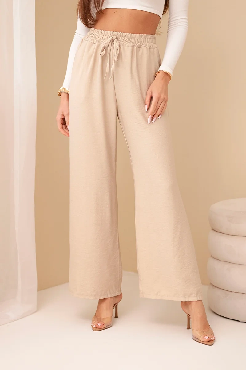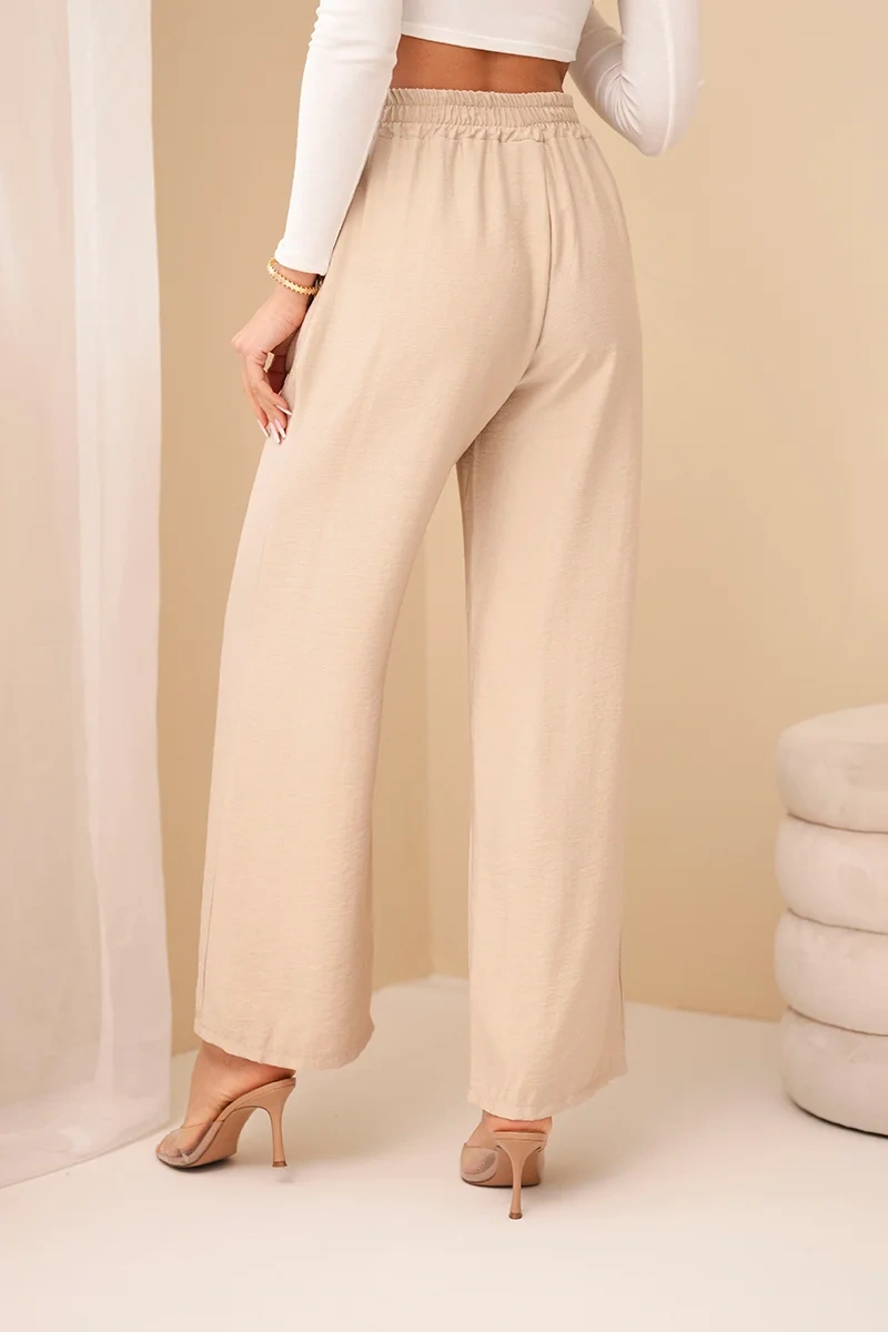 Spodnie z wiskozy z szeroką nogawką ciemno beżowe Spodnie z wiskozy z szeroką nogawką to wyjątkowy element garderoby, który łączy w sobie komfort i elegancję. Wykonane z lekkiego i przewiewnego materiału wiskozy, te spodnie gwarantują nie tylko swobodę ruchów, ale także zapewniają uczucie lekkości i świeżości przez cały dzień. Szeroka nogawka nadaje spodniom charakterystyczny, luźny fason, który jest zarówno modny, jak i wygodny.Dzięki swojemu uniwersalnemu designowi i wysokiej jakości wykonania, te spodnie stanowią niezastąpiony element garderoby, który świetnie uzupełni każdą kolekcję ubrań. Rozmiar jest uniwersalny i będzie odpowiedni dla Pań noszących rozmiar S, M lub L.