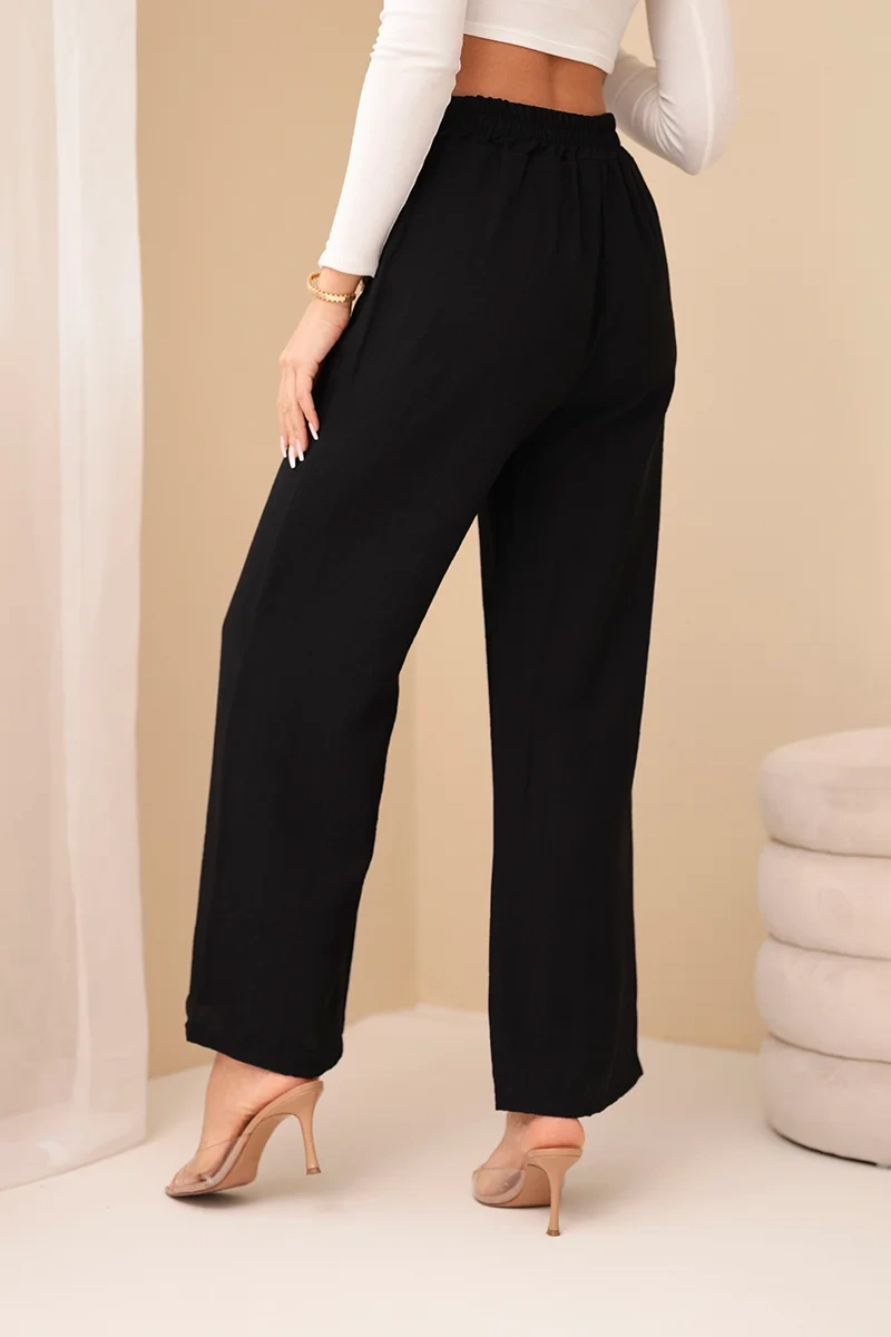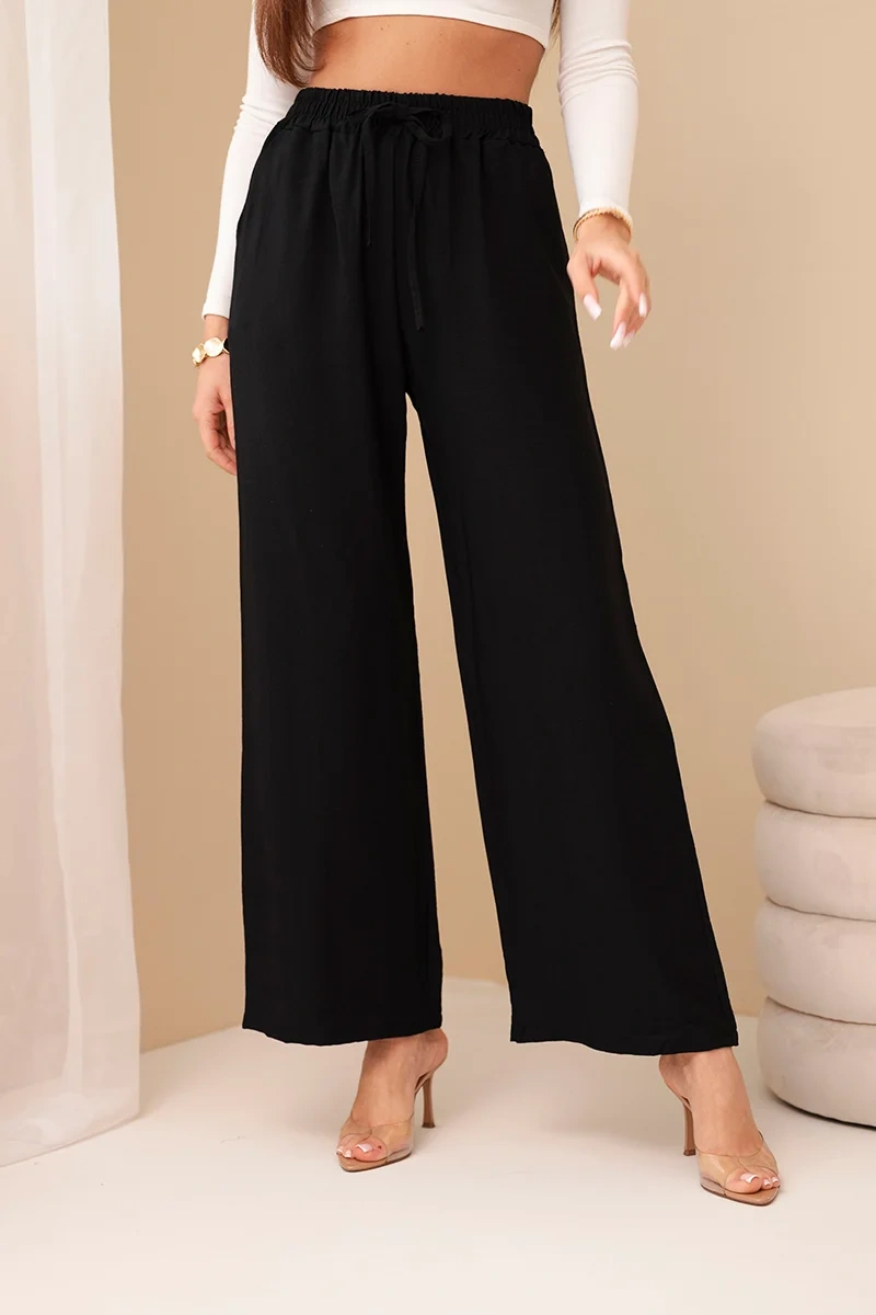 Spodnie z wiskozy z szeroką nogawką to wyjątkowy element garderoby, który łączy w sobie komfort i elegancję. Wykonane z lekkiego i przewiewnego materiału wiskozy, te spodnie gwarantują nie tylko swobodę ruchów, ale także zapewniają uczucie lekkości i świeżości przez cały dzień. Szeroka nogawka nadaje spodniom charakterystyczny, luźny fason, który jest zarówno modny, jak i wygodny. Ten element sprawia, że spodnie prezentują się niezwykle stylowo i efektownie, dodając oryginalności każdej stylizacji. Uniwersalny design spodni z szeroką nogawką sprawia, że doskonale pasują one do różnych okazji i stylizacji. Możesz nosić je zarówno do codziennych, luzackich outfitów, jak i do bardziej eleganckich zestawów na spotkania biznesowe czy wieczorne wyjścia. Spodnie z wiskozy z szeroką nogawką to idealny wybór dla kobiet, które cenią sobie wygodę i styl. Dzięki swojemu uniwersalnemu designowi i wysokiej jakości wykonania, te spodnie stanowią niezastąpiony element garderoby, który świetnie uzupełni każdą kolekcję ubrań. Rozmiar jest uniwersalny i będzie odpowiedni dla Pań noszących rozmiar  S, M lub L.