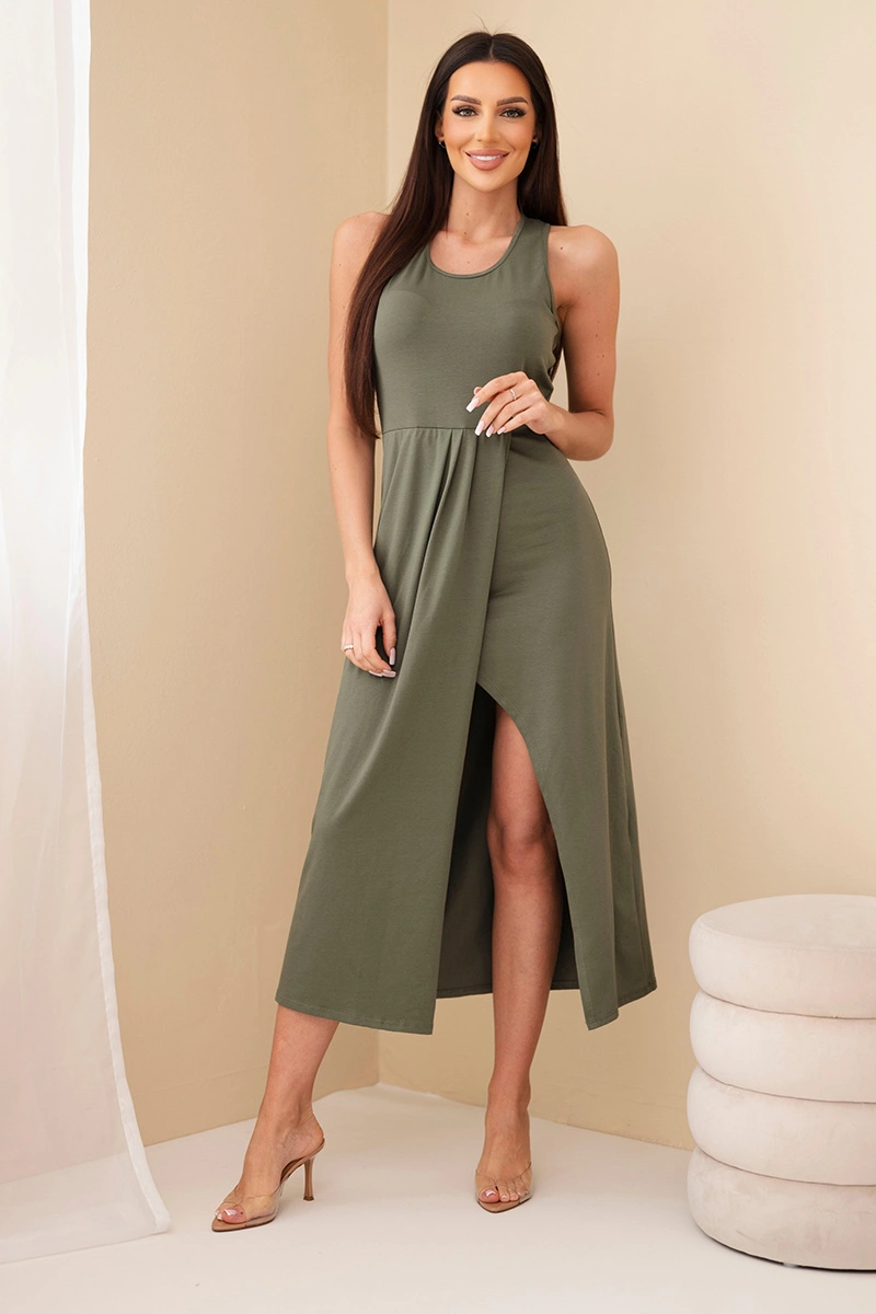 Sukienka damska bawełniana bez rękawów midi z marszczeniem khaki