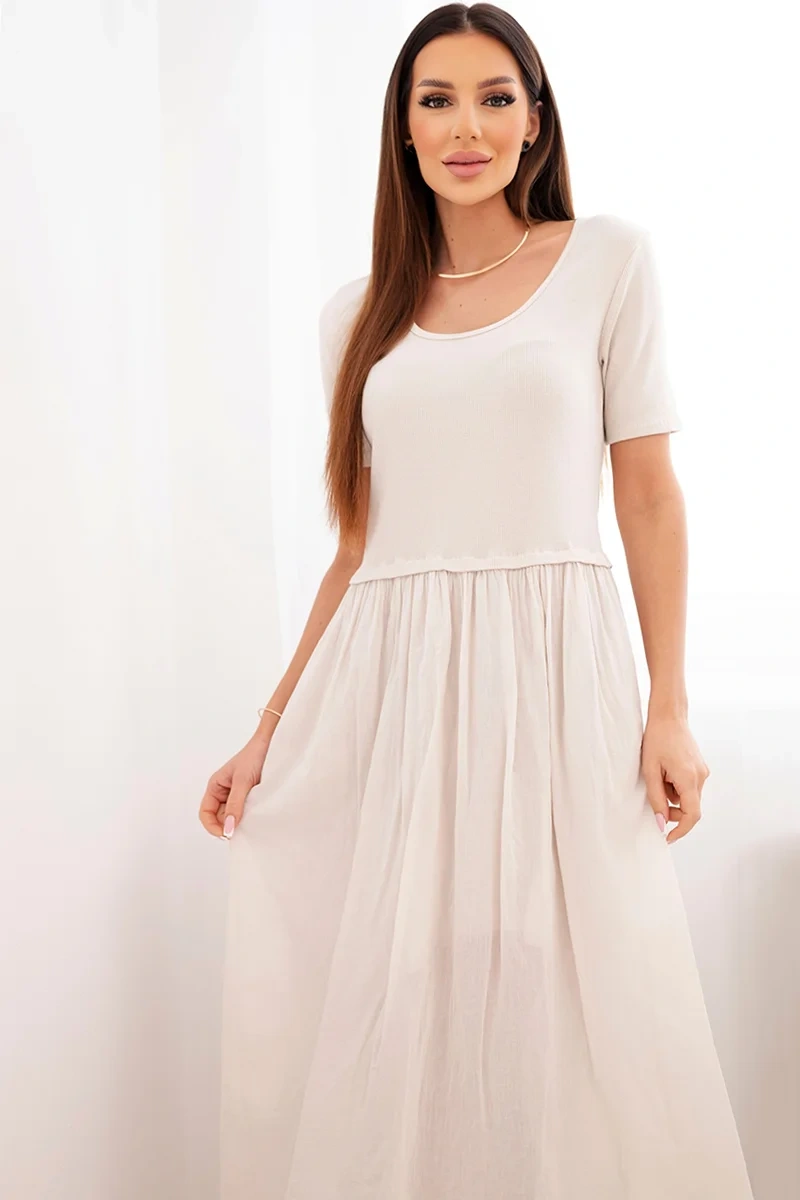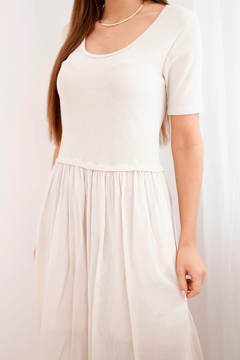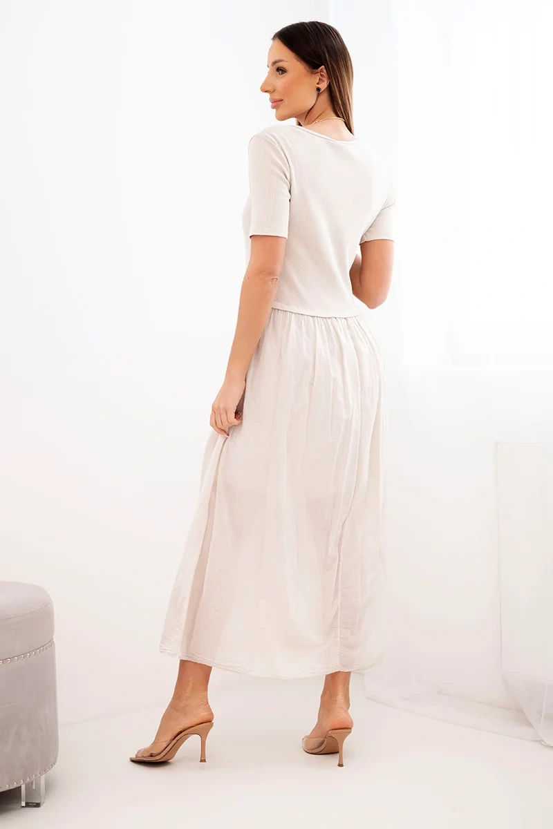Sukienka damska bawełniana midi z krótkim rękawem i rozkloszowanym dołem beżowa Elegancka i jednocześnie niezwykle komfortowa sukienka damska midi to doskonała propozycja dla kobiet ceniących klasykę w nowoczesnym wydaniu. Góra o dopasowanym kroju pięknie podkreśla sylwetkę, natomiast rozkloszowany dół nadaje całości lekkości i kobiecego charakteru. To idealna sukienka damska na co dzień, do pracy, na spacer czy letnie spotkania. Produkcja Włoska gwarantuje staranność wykonania oraz wysoką jakość materiału.