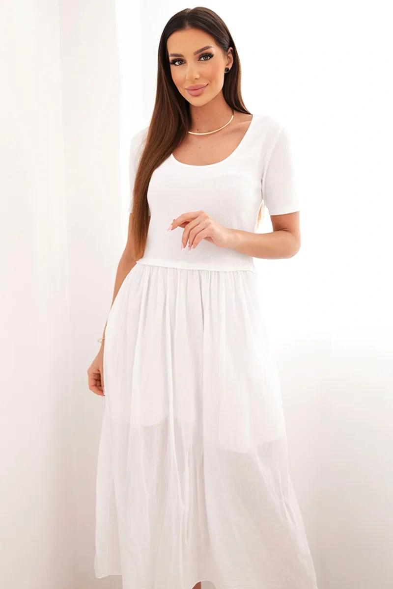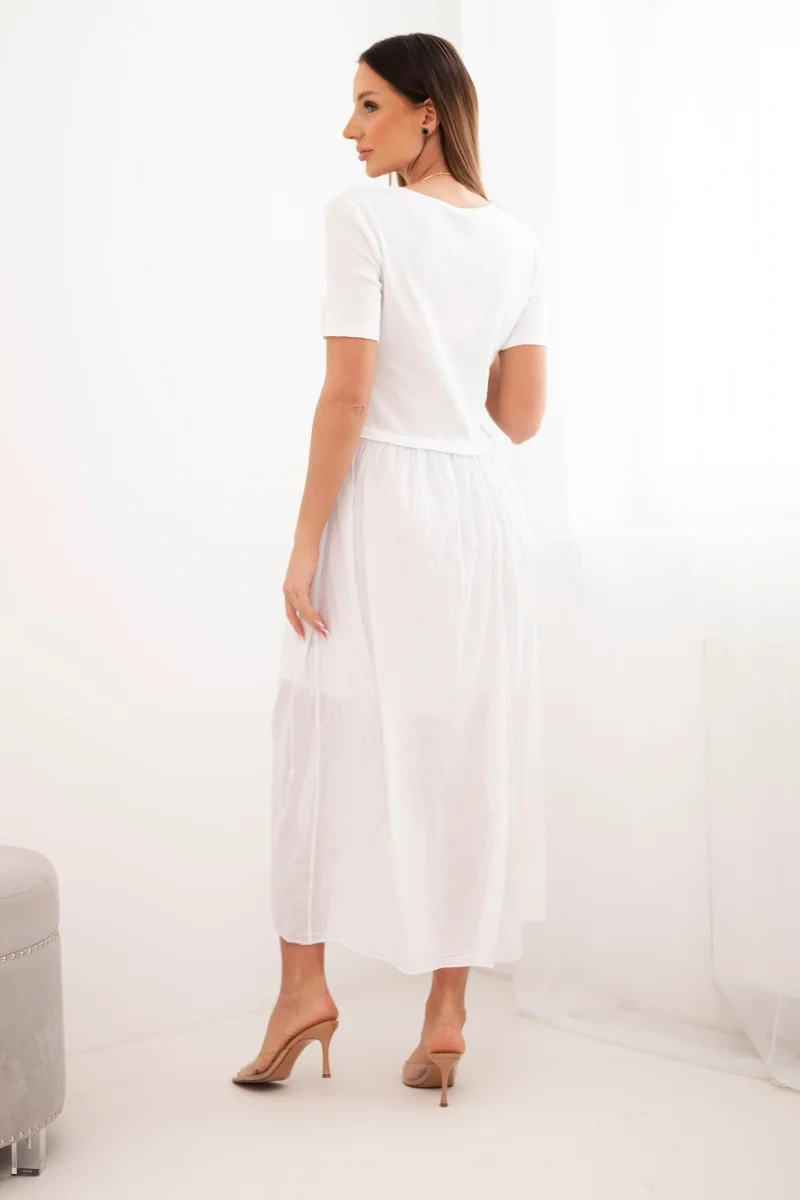 Sukienka damska bawełniana midi z krótkim rękawem i rozkloszowanym dołem biała Elegancka i jednocześnie niezwykle komfortowa sukienka damska midi to doskonała propozycja dla kobiet ceniących klasykę w nowoczesnym wydaniu. Góra o dopasowanym kroju pięknie podkreśla sylwetkę, natomiast rozkloszowany dół nadaje całości lekkości i kobiecego charakteru. To idealna sukienka damska na co dzień, do pracy, na spacer czy letnie spotkania. Produkcja Włoska gwarantuje staranność wykonania oraz wysoką jakość materiału.