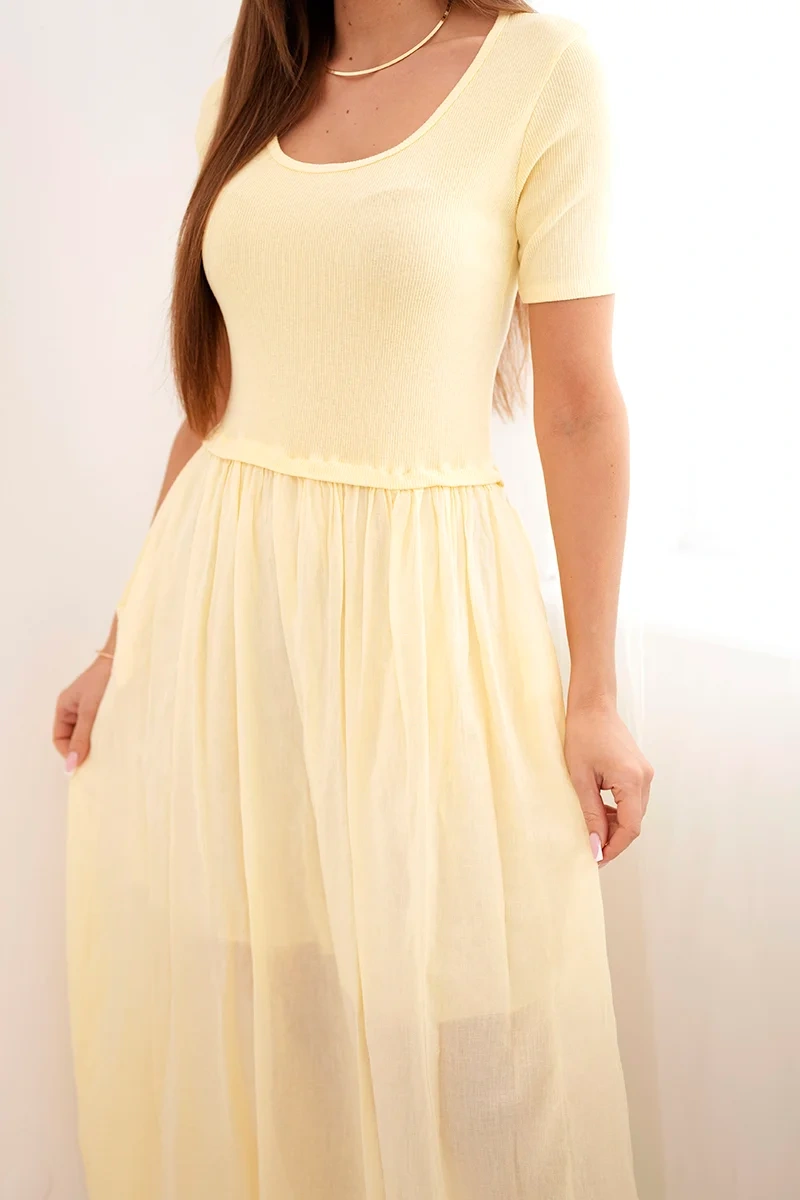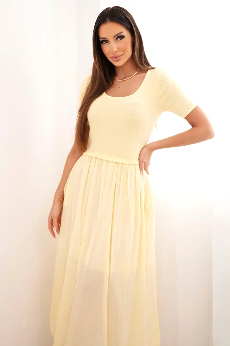 Sukienka damska bawełniana midi z krótkim rękawem i rozkloszowanym dołem żółta Elegancka i jednocześnie niezwykle komfortowa sukienka damska midi to doskonała propozycja dla kobiet ceniących klasykę w nowoczesnym wydaniu. Góra o dopasowanym kroju pięknie podkreśla sylwetkę, natomiast rozkloszowany dół nadaje całości lekkości i kobiecego charakteru. To idealna sukienka damska na co dzień, do pracy, na spacer czy letnie spotkania. Produkcja Włoska gwarantuje staranność wykonania oraz wysoką jakość materiału.