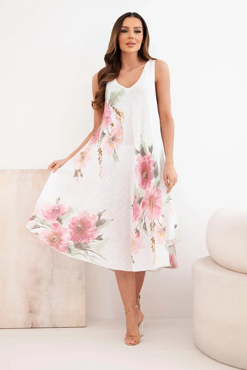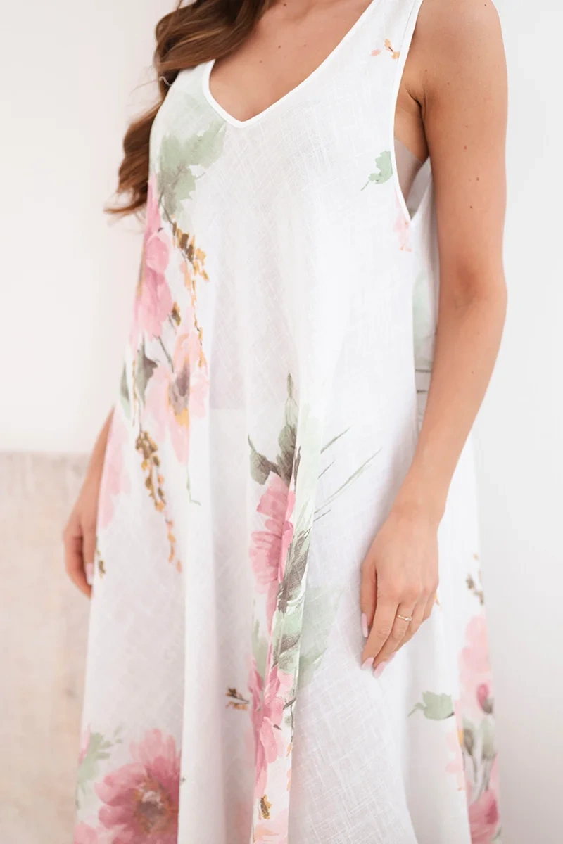 Sukienka damska bawełniana oversize z dekoltem V i kwiatowym nadrukiem biała