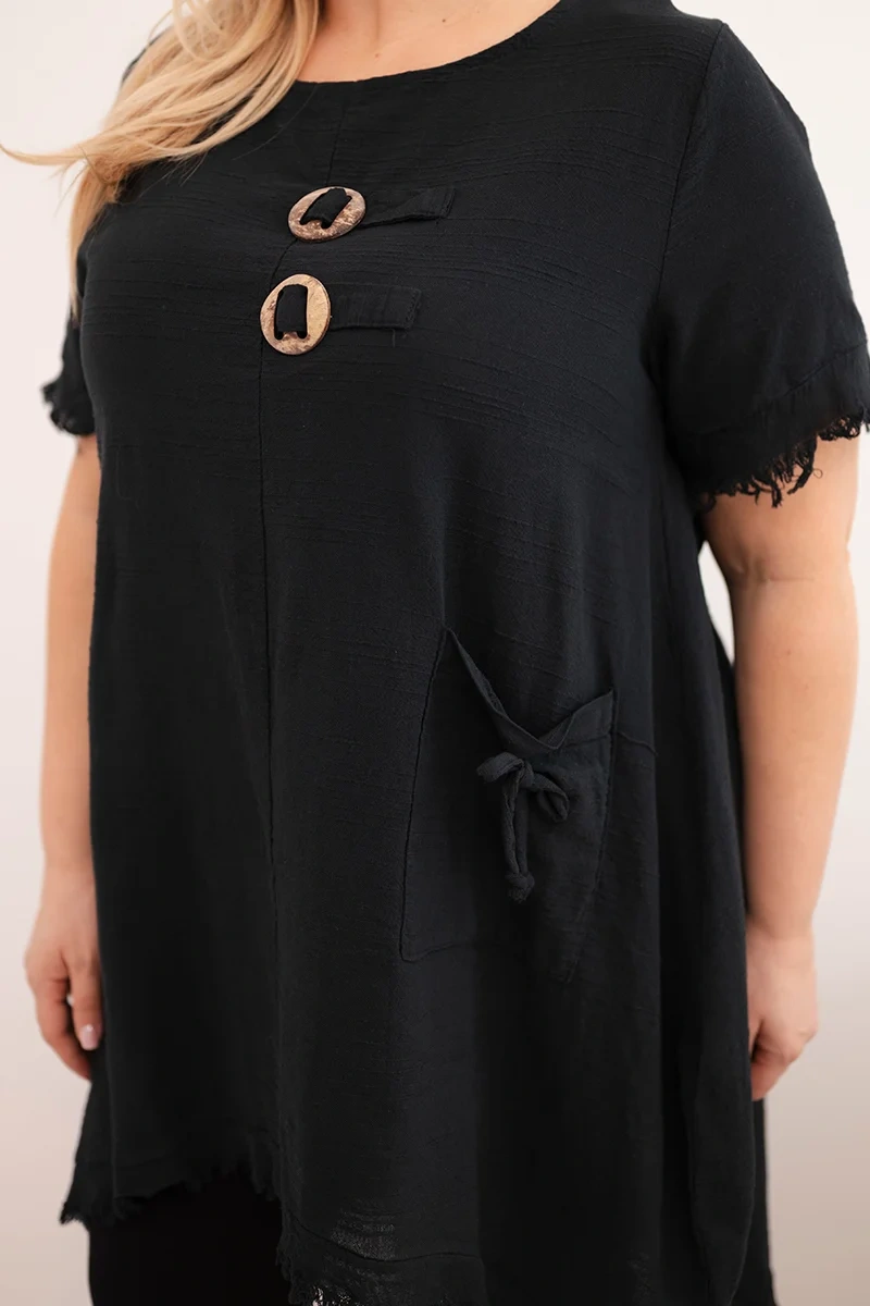 Sukienka damska bawełniana Plus Size z dłuższym tyłem i kieszenią czarna Sukienka damska plus size to wyjątkowa propozycja dla kobiet ceniących wygodę, swobodny styl i naturalne materiały. Wykonana w 100% z bawełny, zachwyca lekkością oraz przewiewnością, dzięki czemu idealnie sprawdzi się w cieplejsze dni. To doskonały wybór na lato, wakacyjne wyjazdy, spacery czy codzienne stylizacje w miejskim i casualowym stylu.