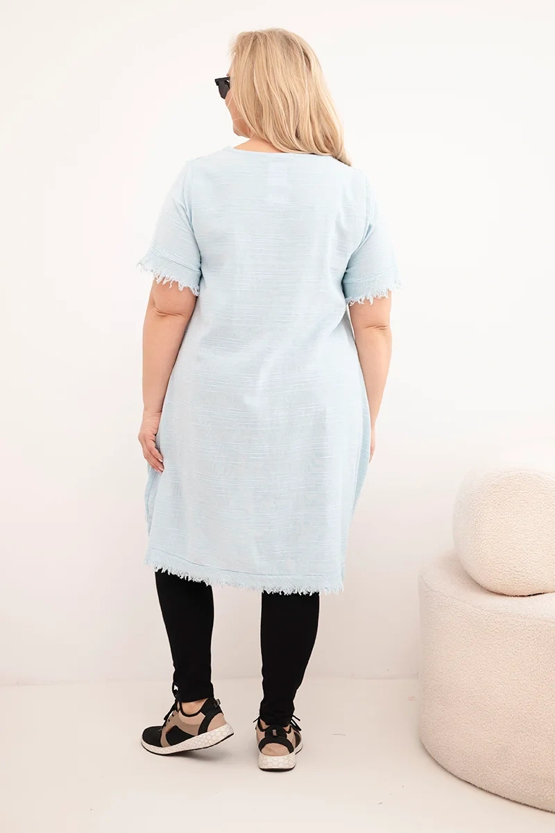 Sukienka damska bawełniana Plus Size z dłuższym tyłem i kieszenią niebieska Sukienka damska plus size to wyjątkowa propozycja dla kobiet ceniących wygodę, swobodny styl i naturalne materiały. Wykonana w 100% z bawełny, zachwyca lekkością oraz przewiewnością, dzięki czemu idealnie sprawdzi się w cieplejsze dni. To doskonały wybór na lato, wakacyjne wyjazdy, spacery czy codzienne stylizacje w miejskim i casualowym stylu.