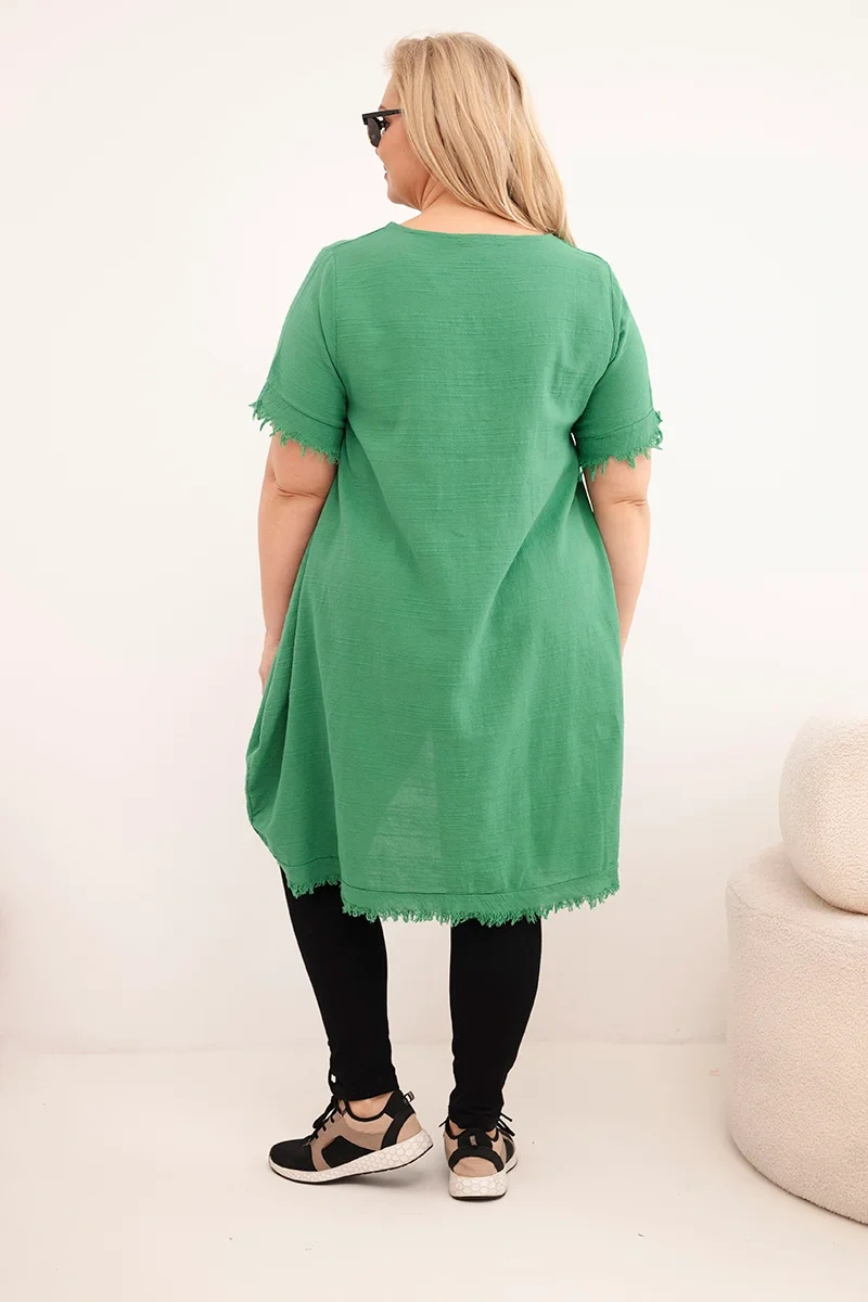 Sukienka damska bawełniana Plus Size z dłuższym tyłem i kieszenią zielona Sukienka damska plus size to wyjątkowa propozycja dla kobiet ceniących wygodę, swobodny styl i naturalne materiały. Wykonana w 100% z bawełny, zachwyca lekkością oraz przewiewnością, dzięki czemu idealnie sprawdzi się w cieplejsze dni. To doskonały wybór na lato, wakacyjne wyjazdy, spacery czy codzienne stylizacje w miejskim i casualowym stylu.