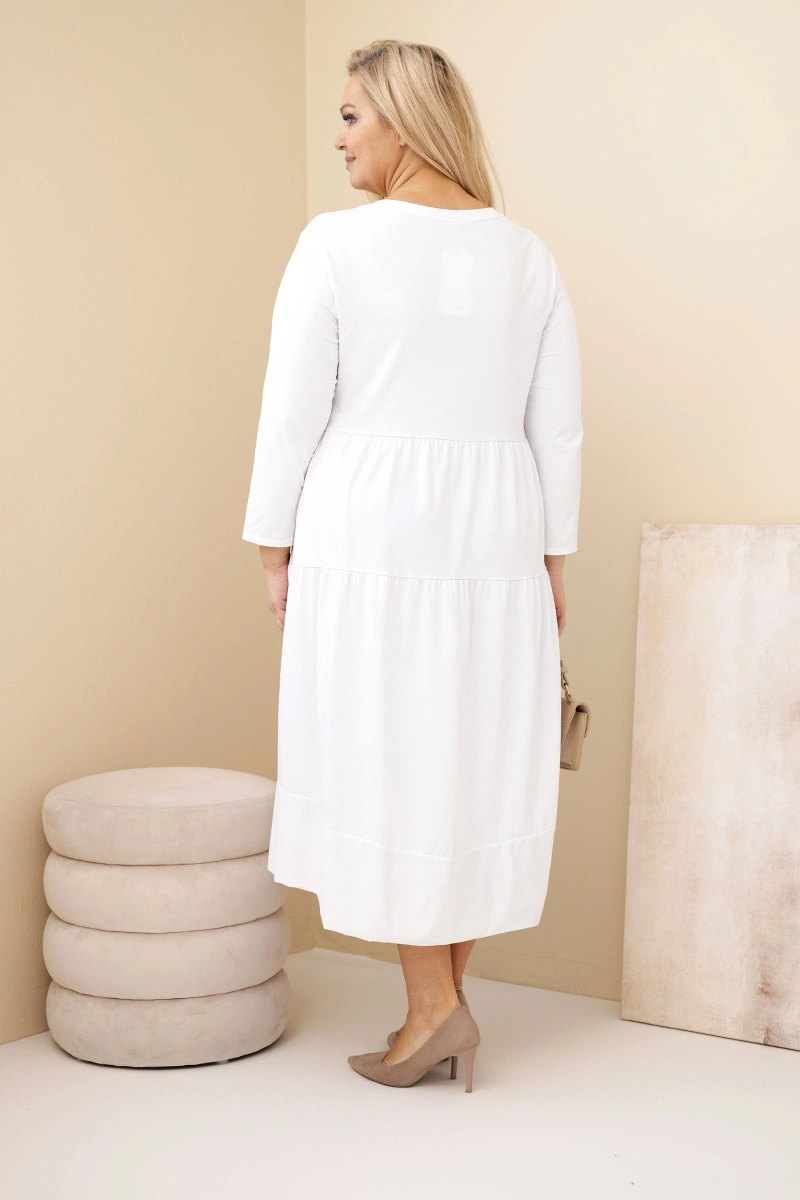 Sukienka damska bawełniana Plus Size z falbanami i podwiniętym rękawem biała Stylowa i bardzo komfortowa sukienka damska Plus Size, wykonana z miękkiej bawełny z dodatkiem elastanu. Model posiada luźny, swobodny krój z efektownymi falbanami, które pięknie układają się na sylwetce. Rękaw można podwinąć, co dodaje całości casualowego charakteru. Sukienka idealna na co dzień, do pracy lub na wyjście — komfortowa, przewiewna i włoska w jakości.