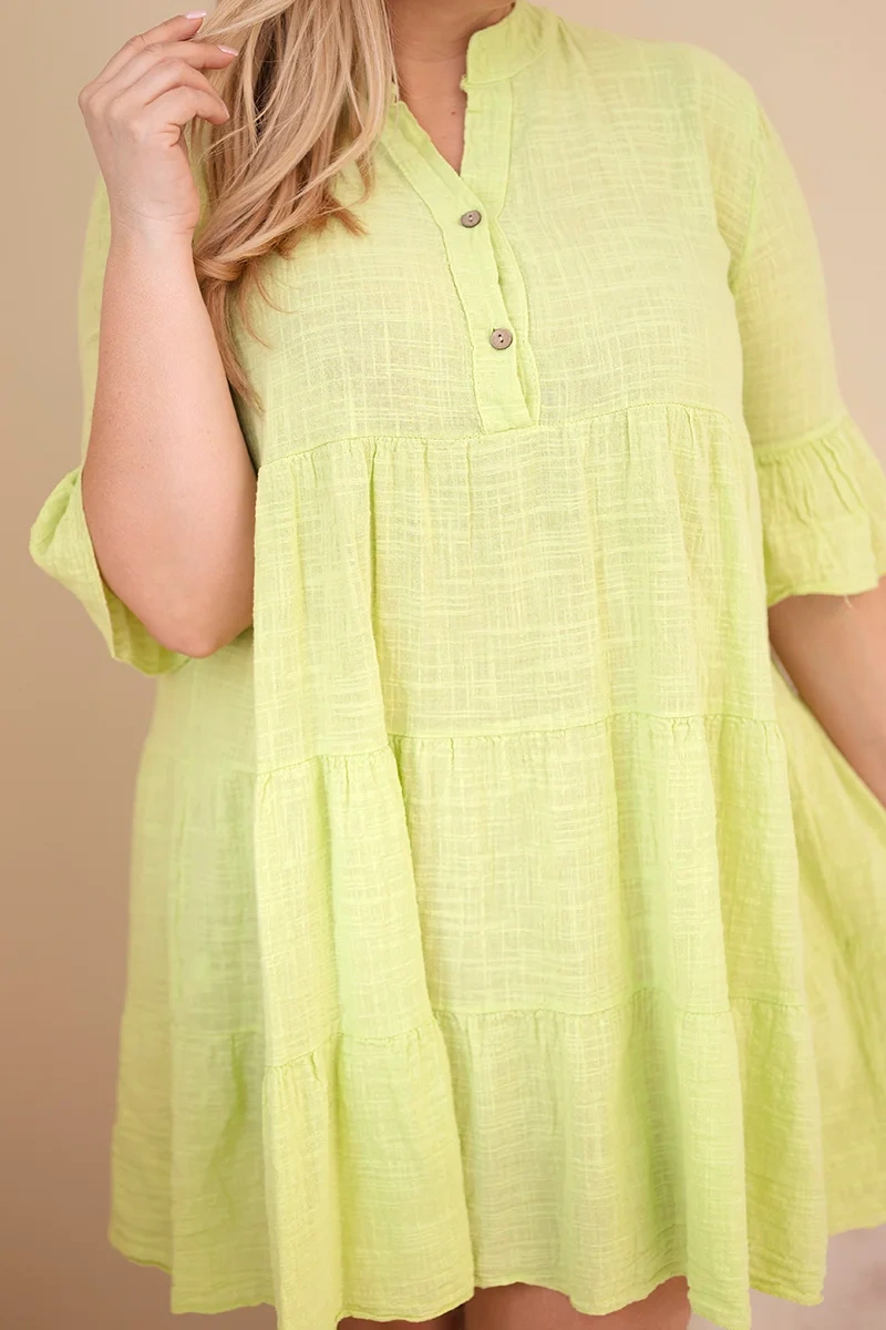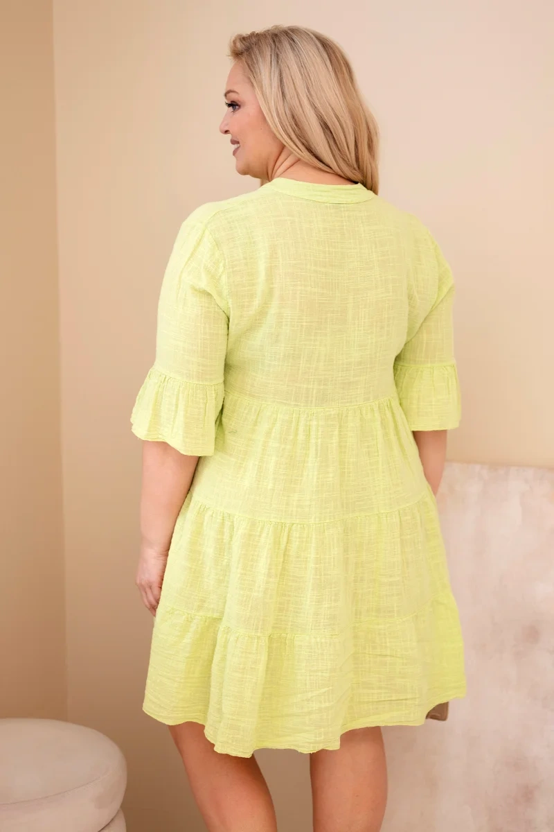 Sukienka damska bawełniana Plus Size z falbanami jasno zielona Sukienka damska plus size to doskonała propozycja dla kobiet, które cenią wygodę, swobodę ruchów oraz ponadczasowy styl. Luźny fason sprawia, że model pięknie układa się na sylwetce, zapewniając komfort noszenia przez cały dzień. To idealna sukienka damska na co dzień, do pracy, na spacer czy spotkanie z przyjaciółmi.