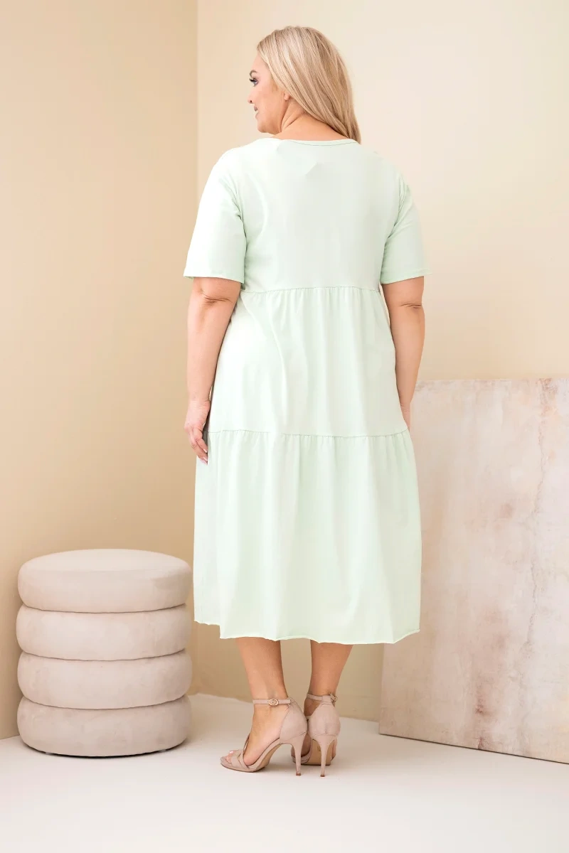 Sukienka damska bawełniana Plus Size z krótkim rękawem i falbaną miętowa Wygodna i stylowa sukienka damska bawełniana w wersji Plus Size to doskonała propozycja dla kobiet ceniących komfort oraz modny, swobodny styl. Model o luźnym fasonie z odcięciem pod biustem i delikatną falbaną u dołu pięknie układa się na sylwetce i zapewnia swobodę ruchów.