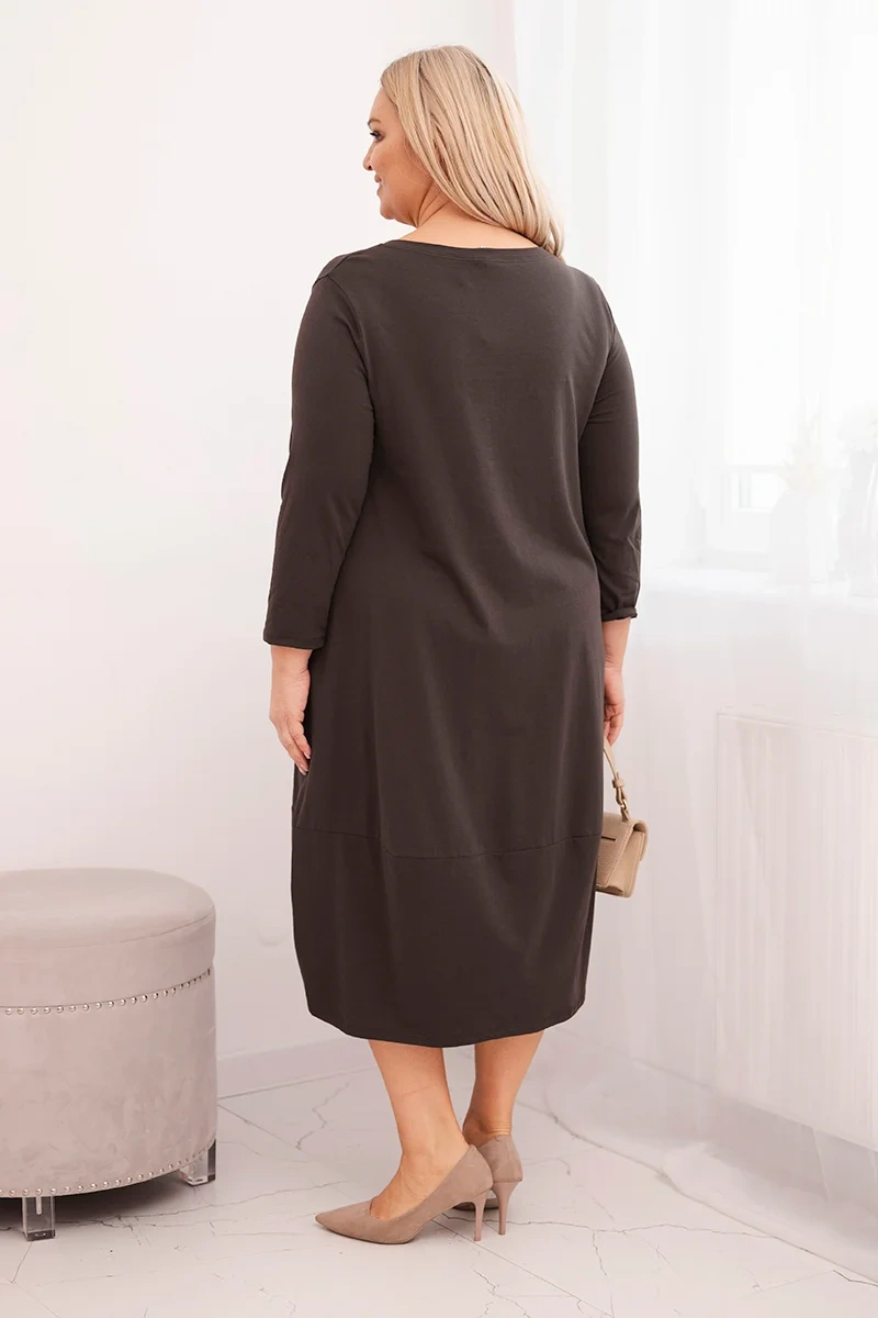 Sukienka damska bawełniana Plus Size z podwijanym rękawem i kieszeniami brązowa Sukienka damska bawełniana Plus Size z podwijanym rękawem i kieszeniami brązowa Wygodna i stylowa sukienka damska Plus Size wykonana z miękkiej, elastycznej bawełny idealnie sprawdzi się w codziennych stylizacjach. Luźny, komfortowy krój pięknie układa się na sylwetce, zapewniając swobodę ruchów, a podwijane rękawy dodają jej lekko casualowego charakteru. Model posiada prostą linię i długość midi, dzięki czemu prezentuje się elegancko i ponadczasowo.