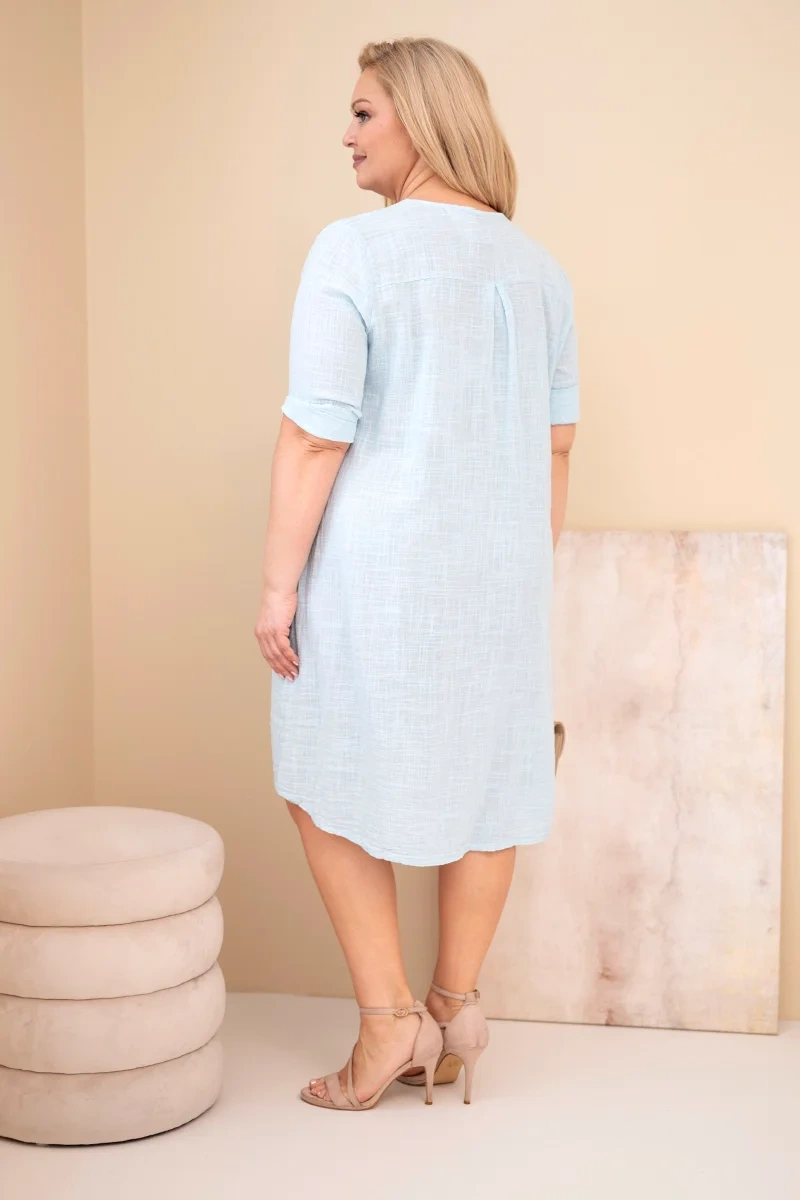 Sukienka damska bawełniana Plus Size z wiązaniem przy dekolcie niebieska Sukienka damska plus size to doskonała propozycja dla kobiet, które cenią wygodę, swobodę i naturalne materiały. Wykonana w 100% z bawełny, zapewnia przewiewność i komfort noszenia nawet w cieplejsze dni. Lekki, oddychający materiał sprawia, że sukienka idealnie sprawdzi się w sezonie wiosenno-letnim, zarówno na co dzień, jak i podczas wakacyjnych wyjazdów.