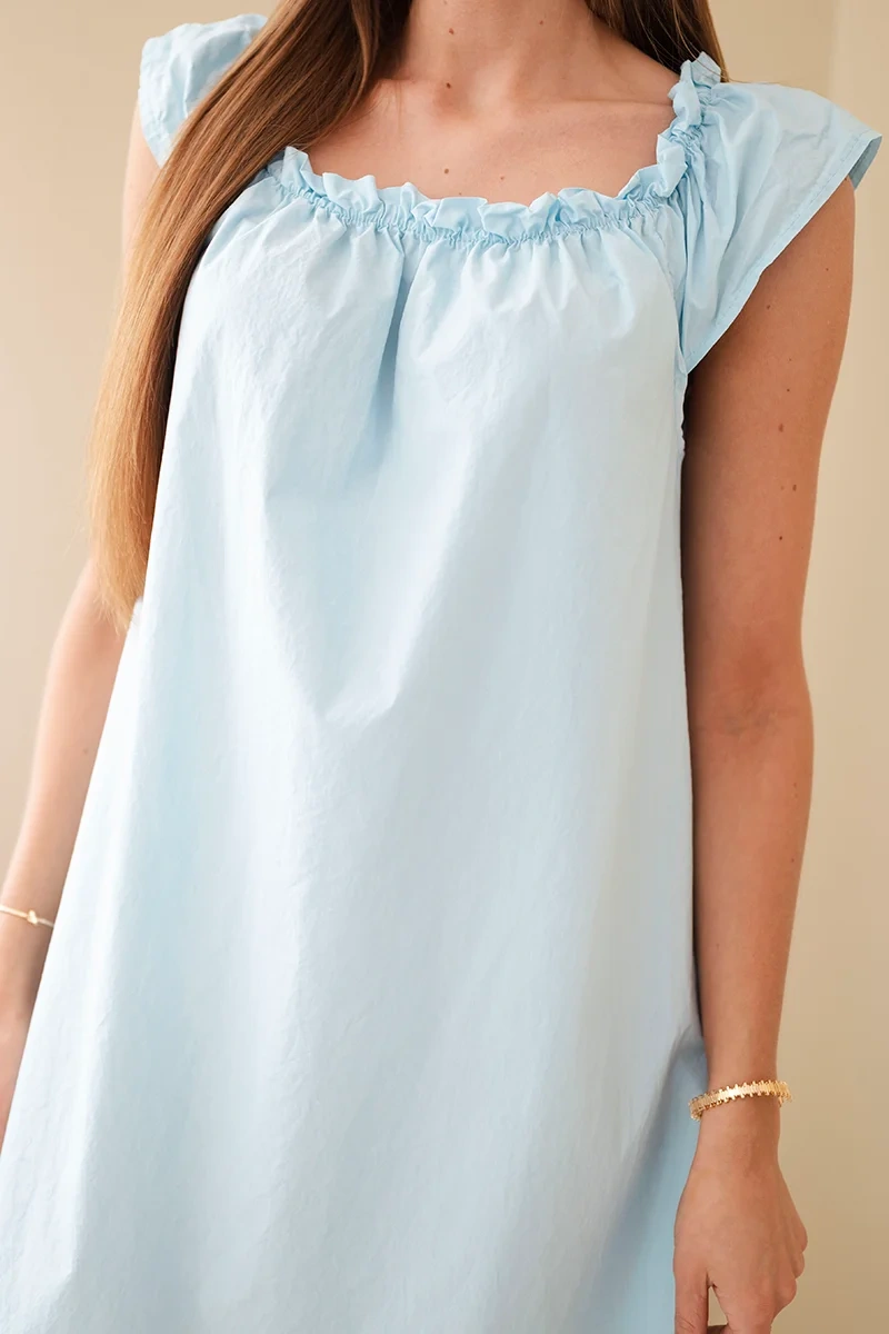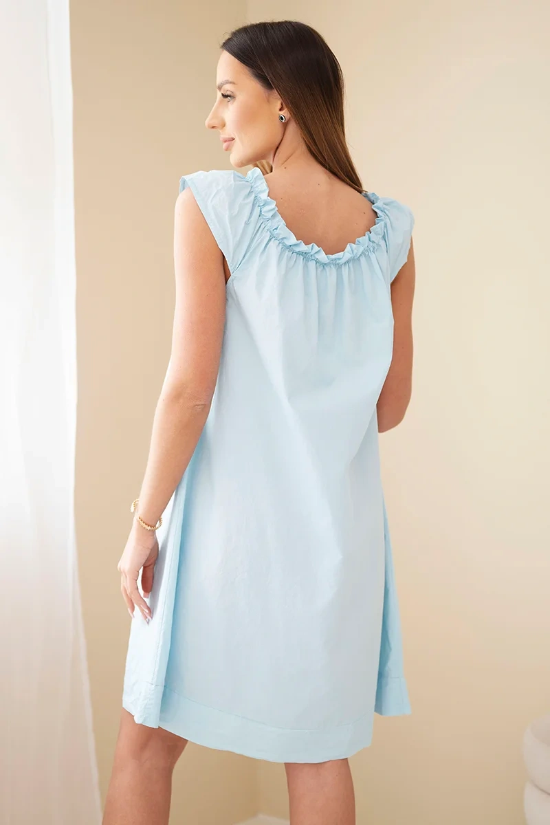 Sukienka damska bawełniana z marszczonym dekoltem i falbanką niebieska