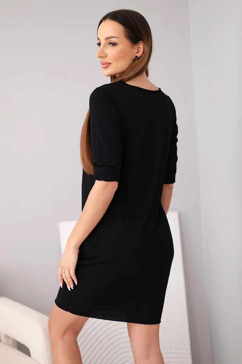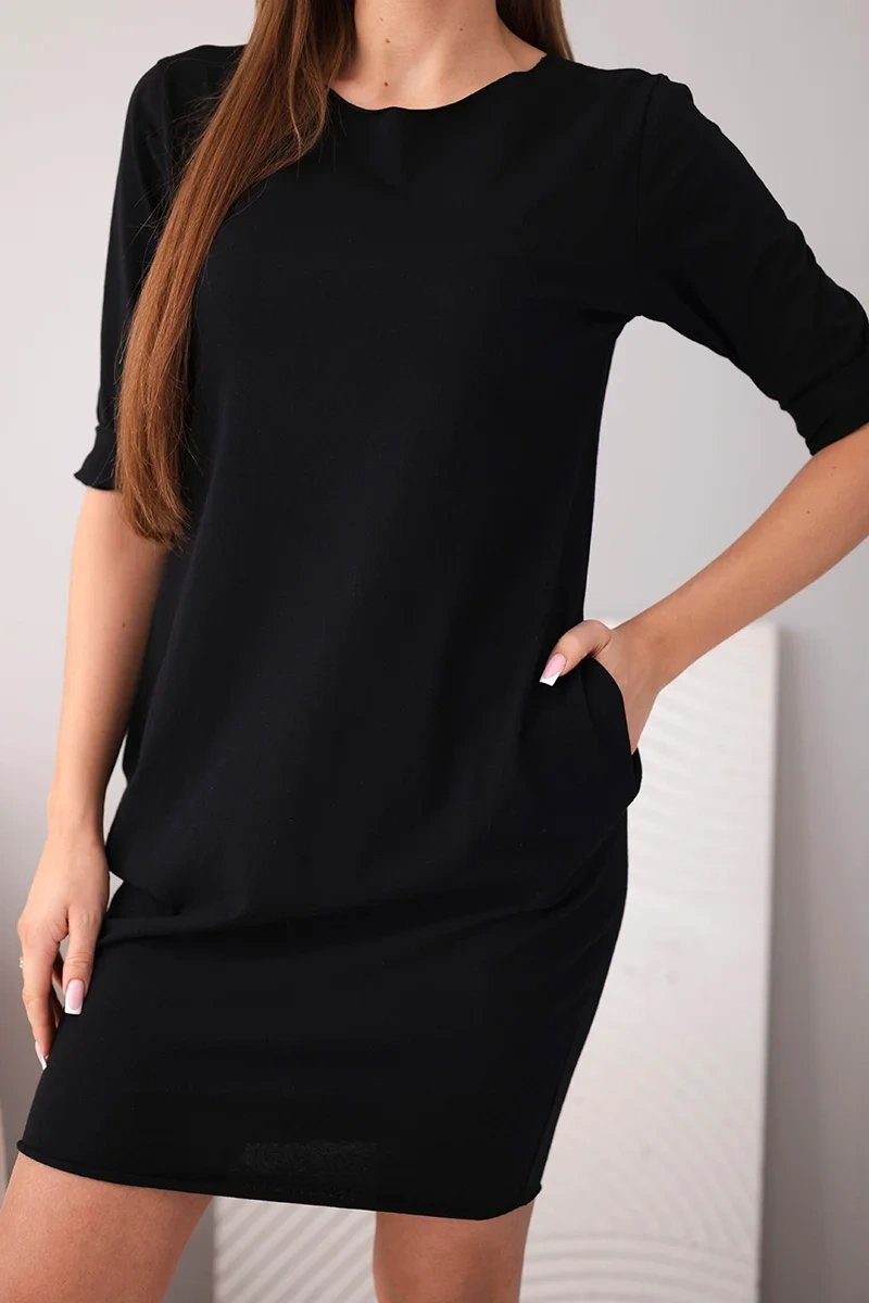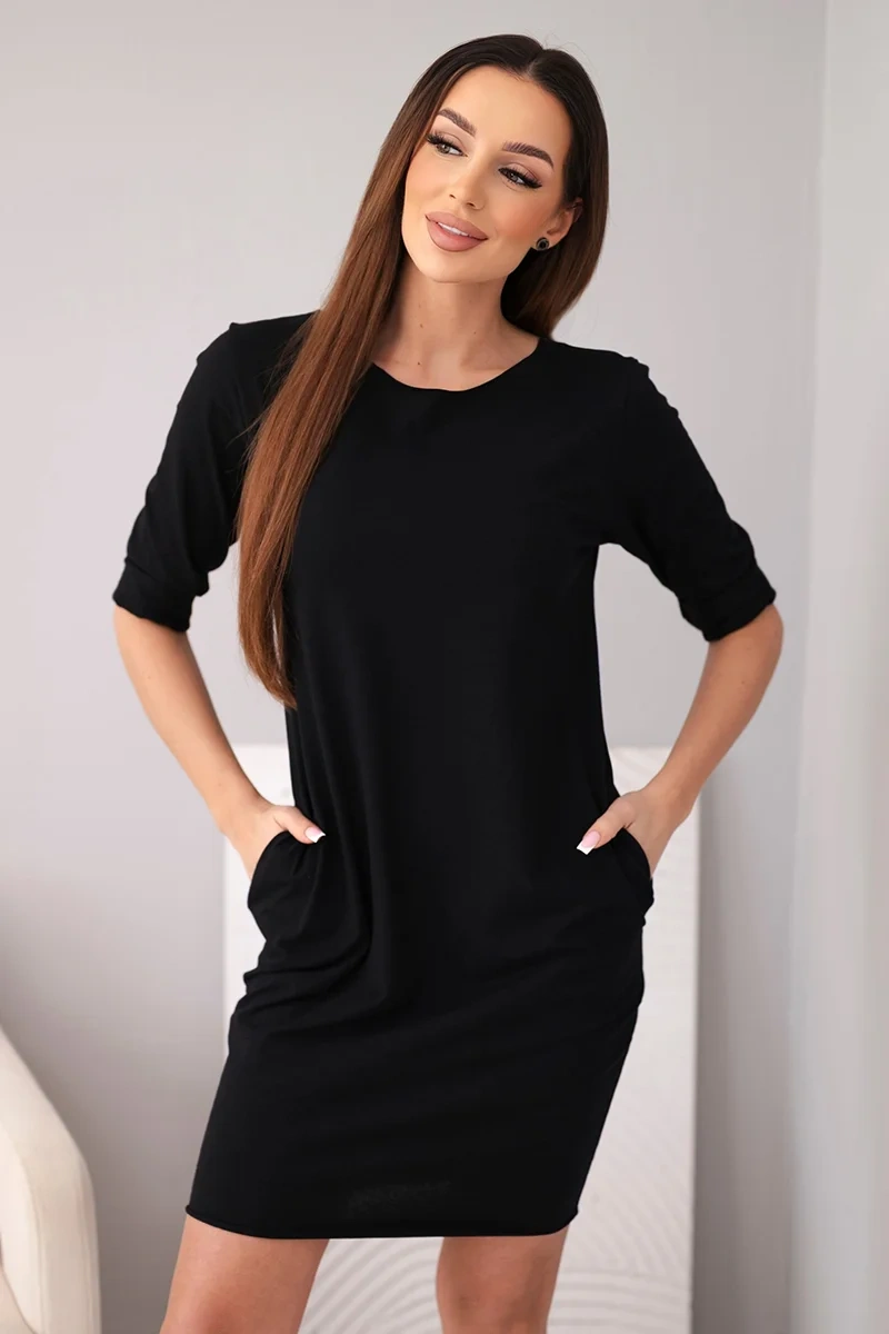 Sukienka damska bawełniana z rękawem 3/4 i kieszeniami czarna Komfortowa sukienka damska o prostym, ponadczasowym kroju to doskonała propozycja na co dzień. Model z rękawem 3/4 oraz klasycznym, półokrągłym dekoltem świetnie sprawdzi się w wielu stylizacjach – zarówno casualowych, jak i bardziej eleganckich. Luźniejszy fason zapewnia swobodę ruchów, a długość przed kolano nadaje sylwetce lekkości.