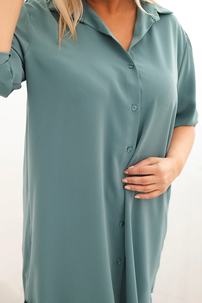 Sukienka damska koszulowa Plus Size z dłuższym tyłem i podwijanym rękawem ciemno miętowa Sukienka damska koszulowa Plus Size to doskonałe połączenie elegancji i wygody w codziennym stylu. Jej luźny krój sprawia, że pięknie układa się na sylwetce, zapewniając pełen komfort noszenia niezależnie od okazji. Klasyczny kołnierzyk, zapięcie na guziki na całej długości oraz praktyczne rękawy 3/4 z możliwością podwinięcia czynią tę sukienkę uniwersalnym wyborem na wiele sezonów.