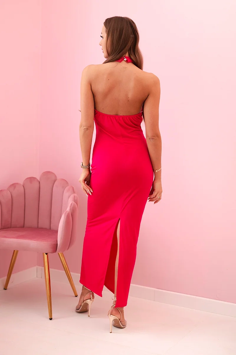 Sukienka damska maxi z odkrytymi plecami i marszczeniem fuksja Zmysłowa sukienka damska maxi z odkrytymi plecami i efektownym marszczeniem z przodu to idealna propozycja na specjalne okazje. Model wykonany z elastycznego, lejącego się materiału pięknie układa się na sylwetce, podkreślając kobiece kształty. Góra na cienkich ramiączkach z szerokim paskiem zakładanym na szyję tworzy stylowy, przyciągający wzrok fason. Sukienka sprawdzi się idealnie na wesela, randki, eleganckie kolacje czy letnie przyjęcia w plenerze.