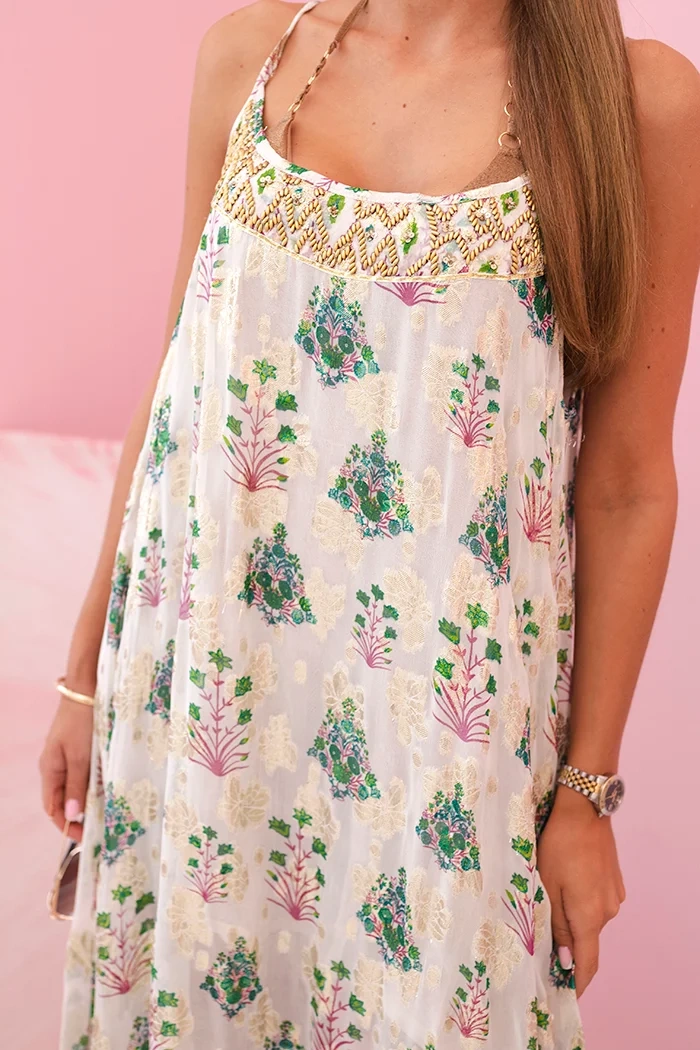 - Detale: cienkie ramiączka, złote aplikacje, orientalny print