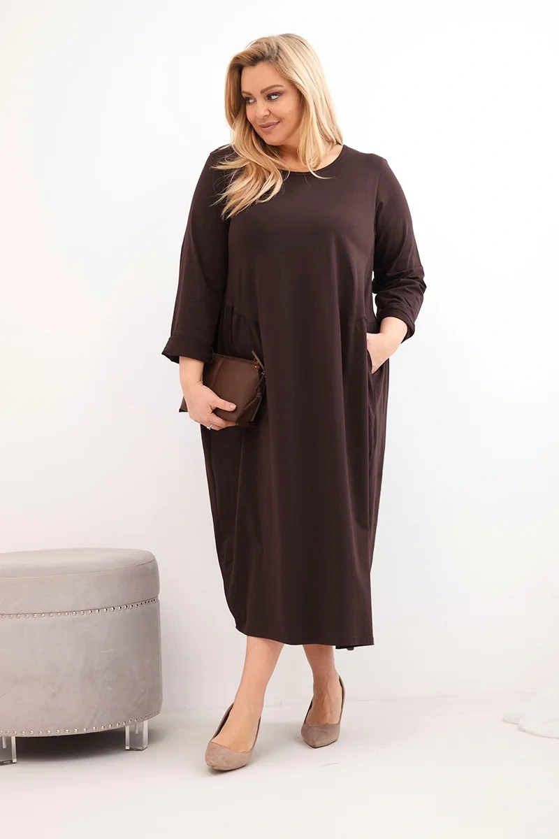 Sukienka damska Plus Size bawełniana z długim rękawem i marszczeniem w talii brązowa Jeśli szukasz wygodnej i stylowej sukienki na co dzień – ten model będzie idealnym wyborem! Sukienka damska o luźnym, swobodnym kroju z delikatnym marszczeniem w talii pięknie układa się na sylwetce i zapewnia komfort noszenia przez cały dzień. Dzięki długim rękawom sprawdzi się zarówno w chłodniejsze dni, jak i w okresie przejściowym. Prosty, klasyczny dekolt dodaje elegancji, a uniwersalna forma sprawia, że świetnie pasuje zarówno do trampek, jak i botków.