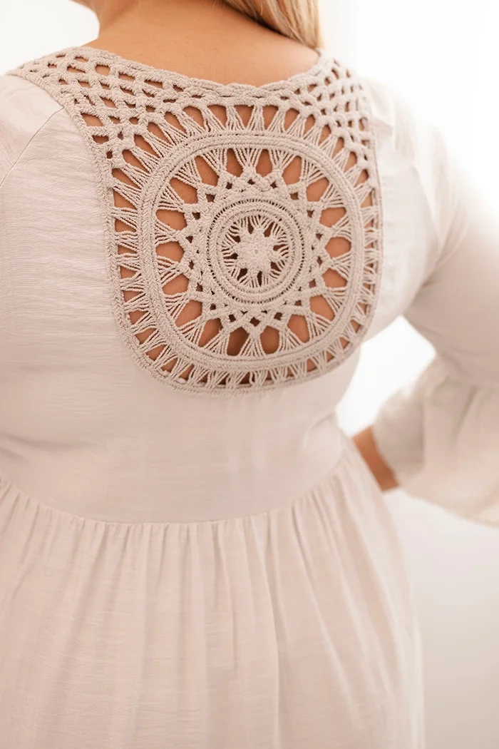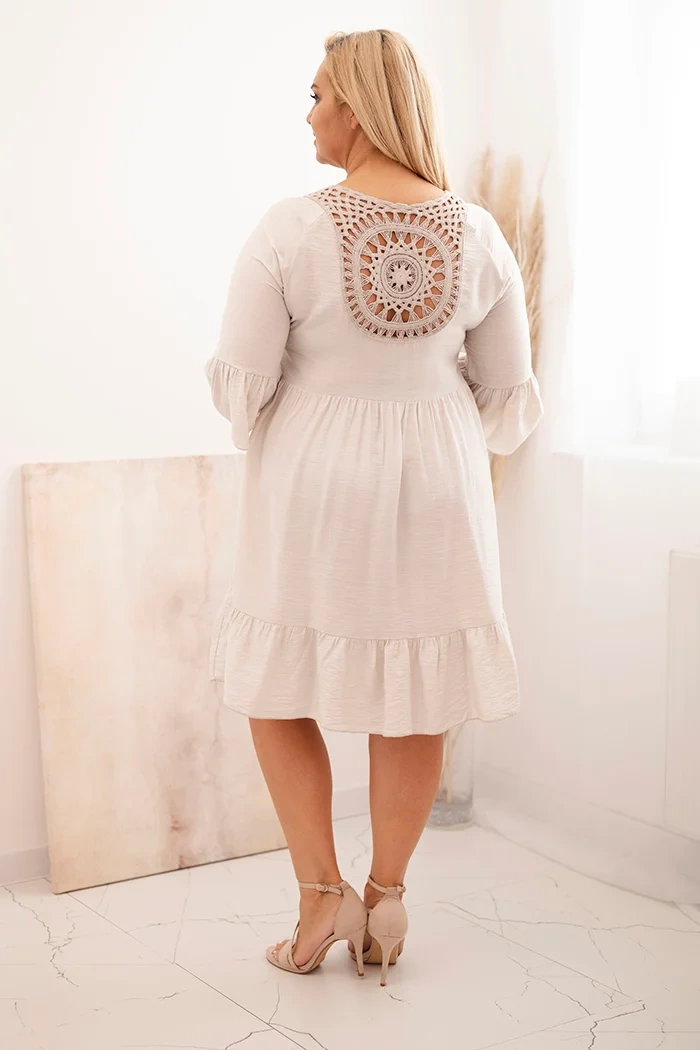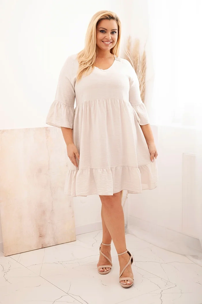 Sukienka damska Plus Size wiskozowa z ażurowym zdobieniem beżowa Jeśli szukasz sukienki, która łączy kobiecy styl z wygodą noszenia, ta propozycja będzie strzałem w dziesiątkę! Sukienka damska z falbanami i dekoracyjnym ażurowym tyłem to doskonały wybór na co dzień, jak i na bardziej wyjątkowe okazje. Jej luźny, swobodny krój pięknie układa się na sylwetce, zapewniając maksymalny komfort i przewiewność. Rękaw 3/4 zakończony falbaną dodaje lekkości, a dolna część wykończona falbaną tworzy subtelny, romantyczny efekt. Wykonana w 100% z wiskozy, sukienka jest miękka, delikatna dla skóry i idealna na cieplejsze dni. Ażurowe zdobienie na plecach nadaje całości modnego, niebanalnego charakteru. To świetna opcja zarówno do pracy, jak i na spacer czy spotkanie z przyjaciółmi.