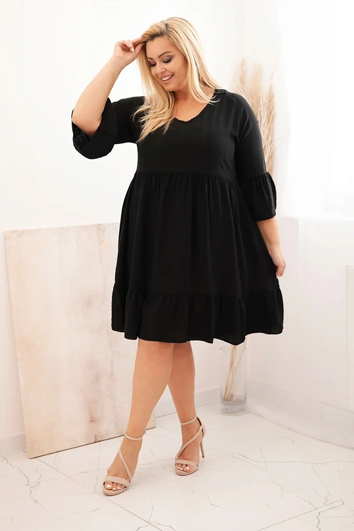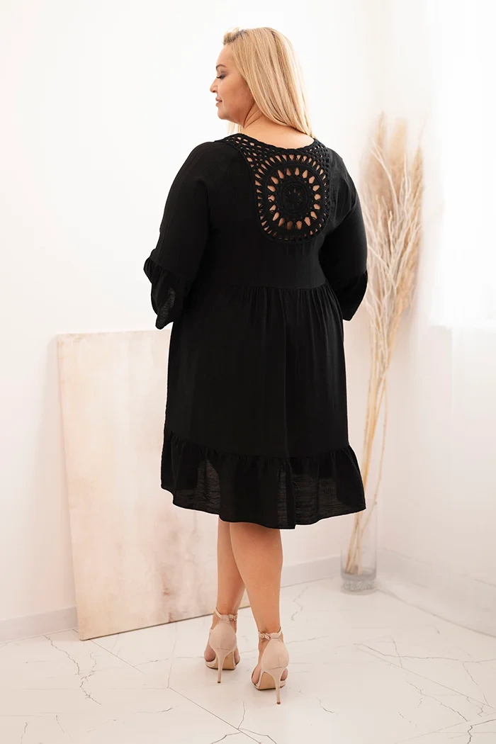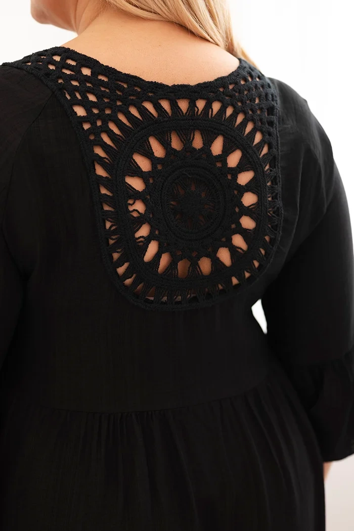 Sukienka damska Plus Size wiskozowa z ażurowym zdobieniem czarna Jeśli szukasz sukienki, która łączy kobiecy styl z wygodą noszenia, ta propozycja będzie strzałem w dziesiątkę! Sukienka damska z falbanami i dekoracyjnym ażurowym tyłem to doskonały wybór na co dzień, jak i na bardziej wyjątkowe okazje. Jej luźny, swobodny krój pięknie układa się na sylwetce, zapewniając maksymalny komfort i przewiewność. Rękaw 3/4 zakończony falbaną dodaje lekkości, a dolna część wykończona falbaną tworzy subtelny, romantyczny efekt. Wykonana w 100% z wiskozy, sukienka jest miękka, delikatna dla skóry i idealna na cieplejsze dni. Ażurowe zdobienie na plecach nadaje całości modnego, niebanalnego charakteru. To świetna opcja zarówno do pracy, jak i na spacer czy spotkanie z przyjaciółmi.