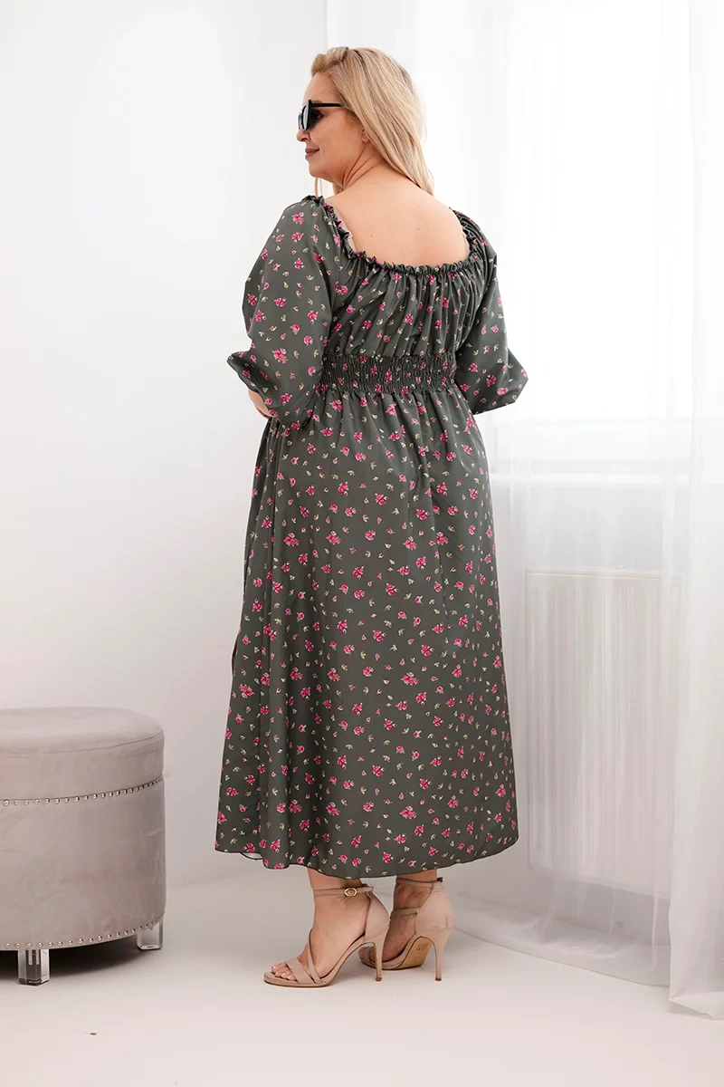 Sukienka damska Plus Size z dekoltem na troczki i elastyczną talią khaki Ta romantyczna sukienka damska maxi w drobny kwiatowy wzór to idealna propozycja na wiosnę i lato! Posiada kobiecy dekolt na troczki, który można regulować, oraz elastyczną talię podkreślającą sylwetkę. Bufiaste rękawy do łokcia dodają lekkości i subtelnego uroku. Luźny, lekki materiał zapewnia komfort przez cały dzień, a długość maxi sprawia, że sukienka świetnie sprawdzi się zarówno na co dzień, jak i na specjalne okazje, takie jak garden party, urlop czy rodzinne spotkania.