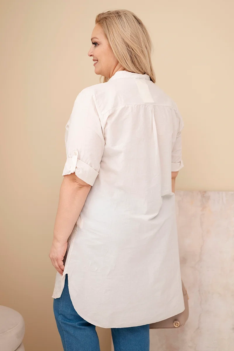 Sukienka damska Plus Size z haftem i podwijanym rękawem beżowa Ta bawełniana sukienka damska to idealne połączenie lekkości, wygody i subtelnego stylu. Wykonana w 100% z naturalnej tkaniny, gwarantuje komfort noszenia nawet w cieplejsze dni. Delikatny haft w modny wzór paisley dodaje jej elegancji i unikalnego charakteru. Model posiada luźny fason, który nie opina sylwetki, oraz rękawy z możliwością podwinięcia i zapięcia na guziczek. Sukienka świetnie sprawdzi się jako samodzielna stylizacja lub jako narzutka na top i legginsy – idealna na wiosnę, lato i wakacyjne wyjazdy.