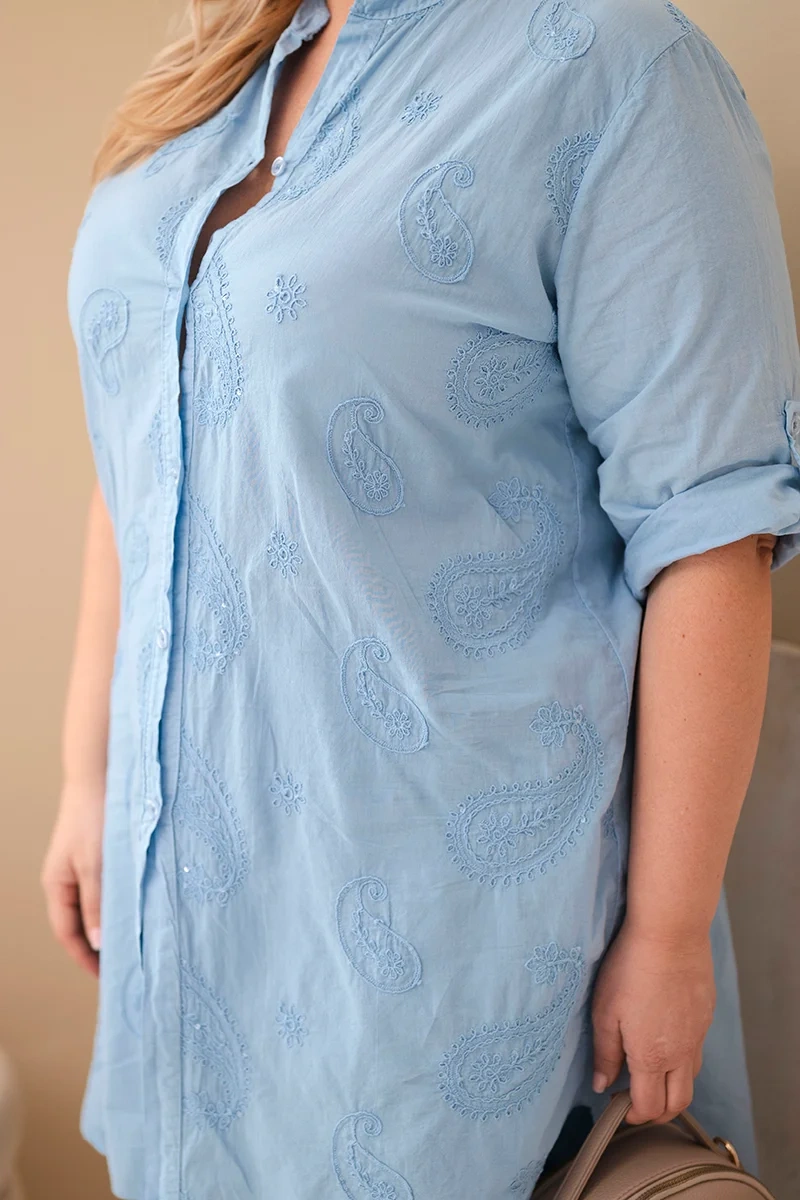 Sukienka damska Plus Size z haftem i podwijanym rękawem niebieska Ta bawełniana sukienka damska to idealne połączenie lekkości, wygody i subtelnego stylu. Wykonana w 100% z naturalnej tkaniny, gwarantuje komfort noszenia nawet w cieplejsze dni. Delikatny haft w modny wzór paisley dodaje jej elegancji i unikalnego charakteru. Model posiada luźny fason, który nie opina sylwetki, oraz rękawy z możliwością podwinięcia i zapięcia na guziczek. Sukienka świetnie sprawdzi się jako samodzielna stylizacja lub jako narzutka na top i legginsy – idealna na wiosnę, lato i wakacyjne wyjazdy.
