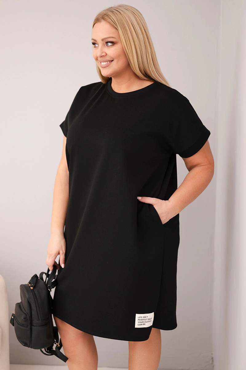 Sukienka damska Plus Size z krótkim rękawem i kieszeniami czarna Sukienka damska plus size to doskonała propozycja dla kobiet, które cenią sobie wygodę, swobodę ruchów i modny, codzienny styl. Luźny fason sprawia, że model pięknie układa się na sylwetce, a jednocześnie zapewnia komfort noszenia przez cały dzień. To świetny wybór na co dzień, do pracy, na spacer, zakupy czy spotkanie z przyjaciółmi. Produkcja Włoska gwarantuje staranne wykonanie oraz dbałość o detale.