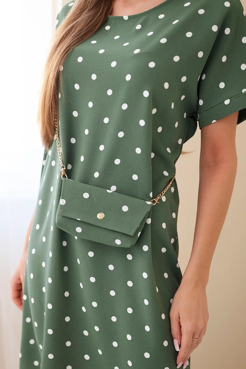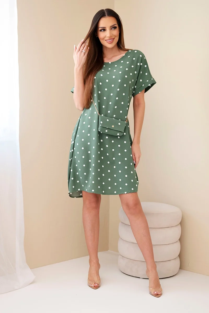 Sukienka damska w grochy z krótkim rękawem i torebką khaki Sukienka damska oversize w grochy z krótkim rękawem to stylowa i wygodna propozycja na co dzień oraz letnie wyjścia. Klasyczny wzór w grochy nadaje jej ponadczasowego uroku, a luźny fason zapewnia maksymalny komfort noszenia i swobodę ruchów. Model wyróżnia się również praktycznym dodatkiem w postaci małej torebki na łańcuszku, która idealnie dopełnia całość stylizacji.