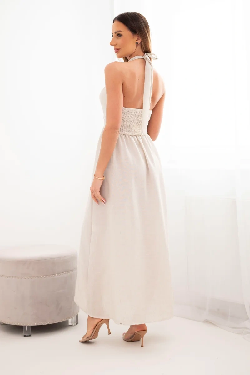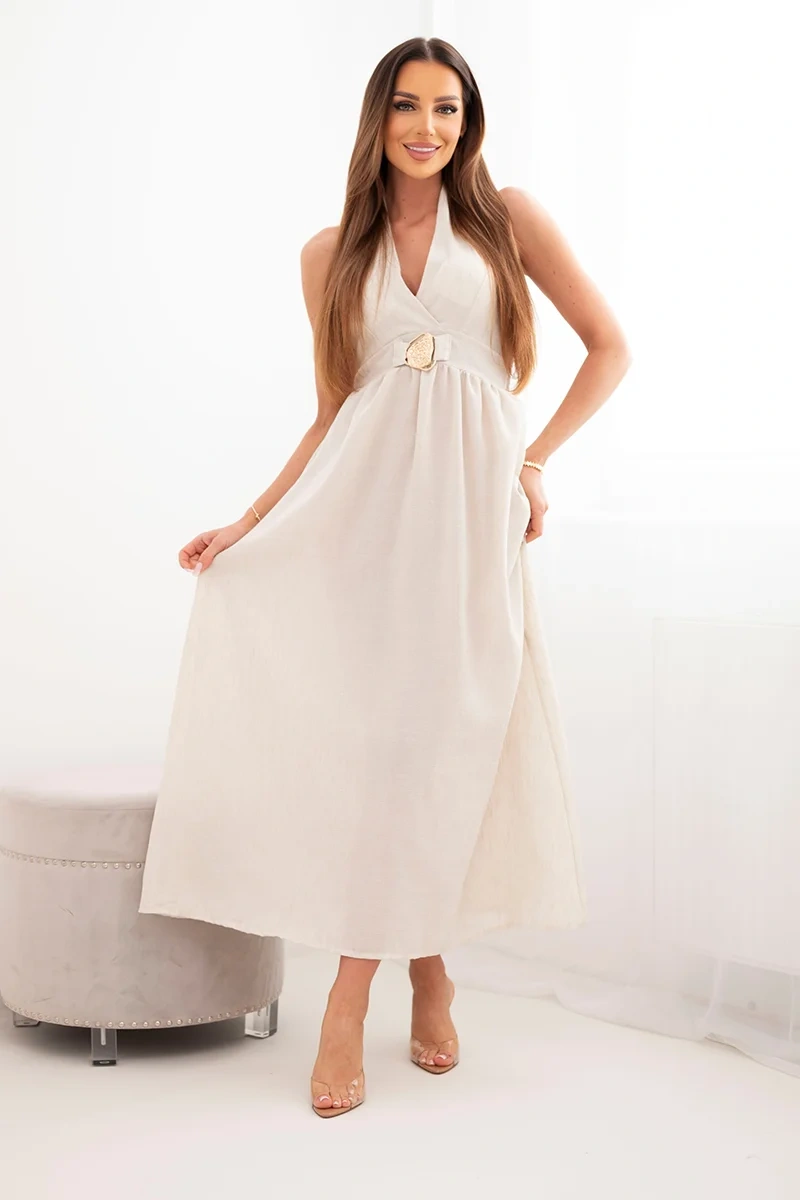 Sukienka damska wiskozowa maxi wiązana na szyi z ozdobną klamrą beżowa