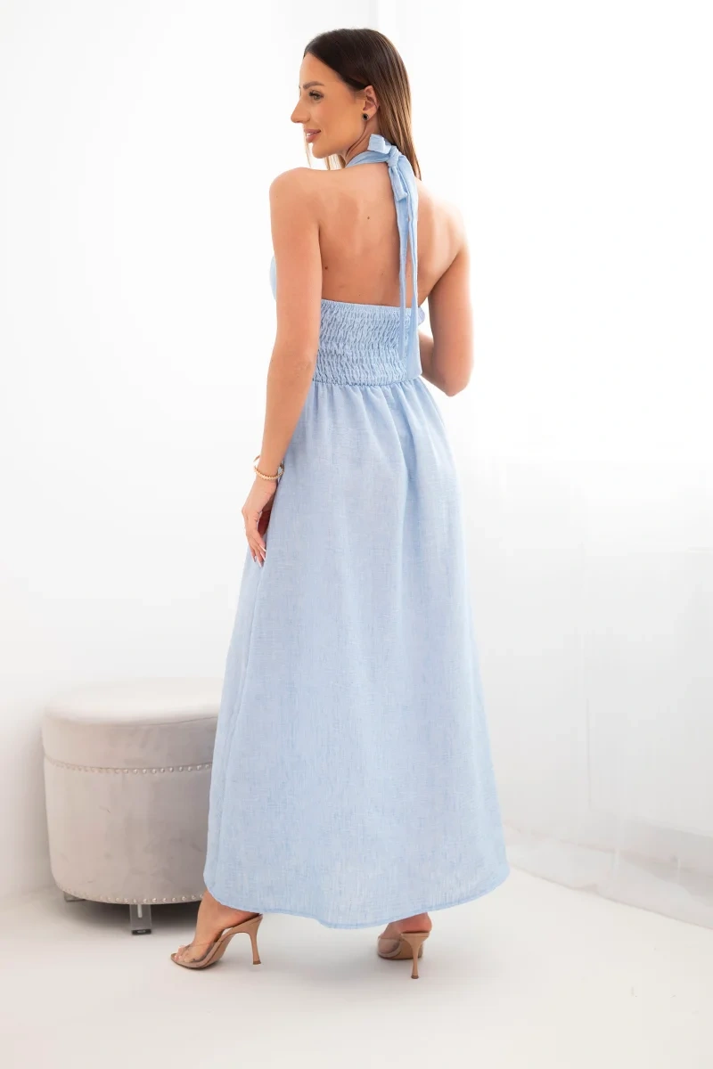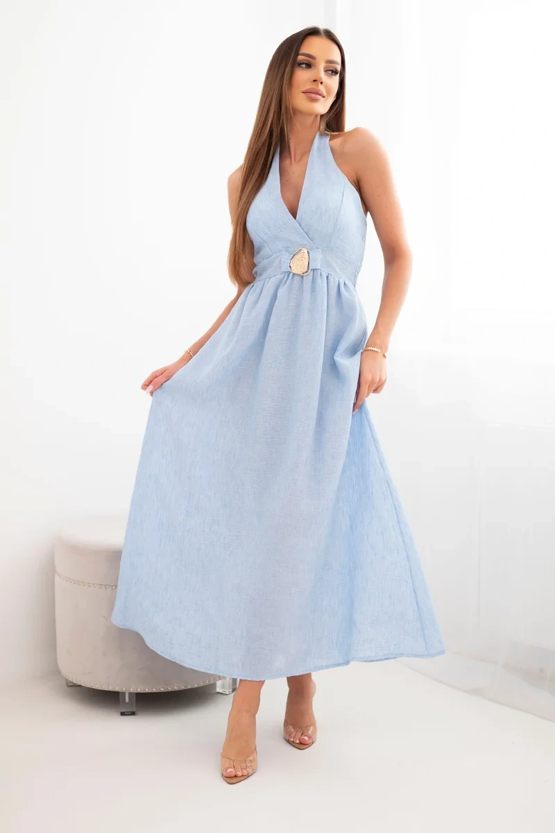 Sukienka damska wiskozowa maxi wiązana na szyi z ozdobną klamrą niebieska