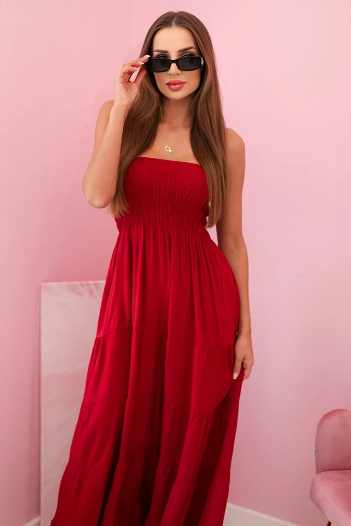 Sukienka damska wiskozowa z elastyczną górą bordowa Ta sukienka damska maxi to idealna propozycja na cieplejsze dni – zachwyca lekkością, kobiecym fasonem i wygodą noszenia. Dzięki elastycznej, marszczonej górze pięknie dopasowuje się do sylwetki, podkreślając talię i biust, a rozkloszowany dół nadaje całości lekkości i swobody. Uszyta w 100% z przewiewnej wiskozy, zapewnia komfort przez cały dzień – niezależnie czy wybierzesz ją na spacer, wakacje czy spotkanie ze znajomymi. Model jest niezwykle kobiecy i uniwersalny – świetnie sprawdzi się zarówno solo, jak i w zestawieniu z jeansową kurtką czy sandałami. Delikatne marszczenia dodają jej uroku i sprawiają, że prezentuje się wyjątkowo efektownie. Rozmiar jest uniwersalny i będzie odpowiedni dla Pań w rozmiarze S, M lub L.
