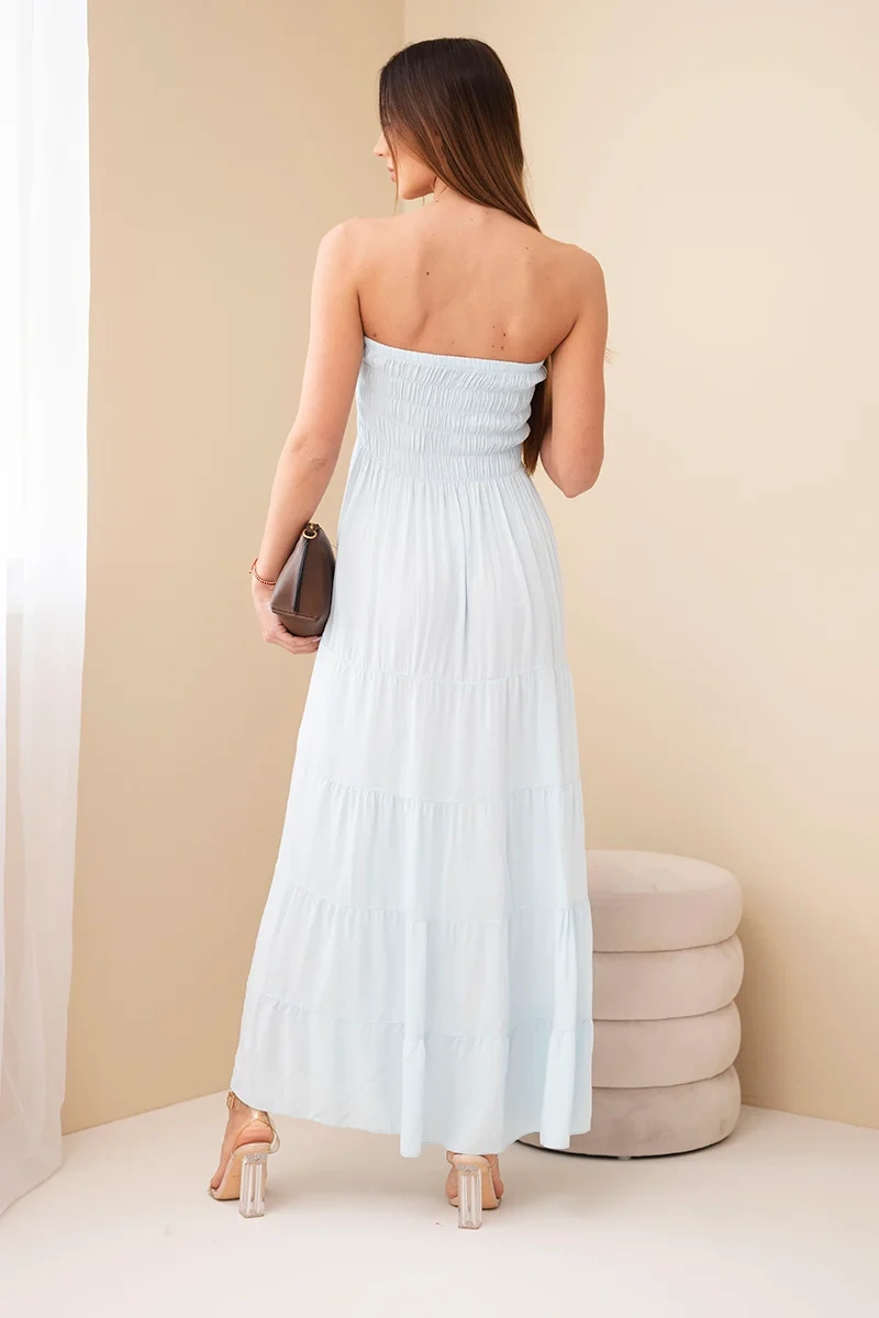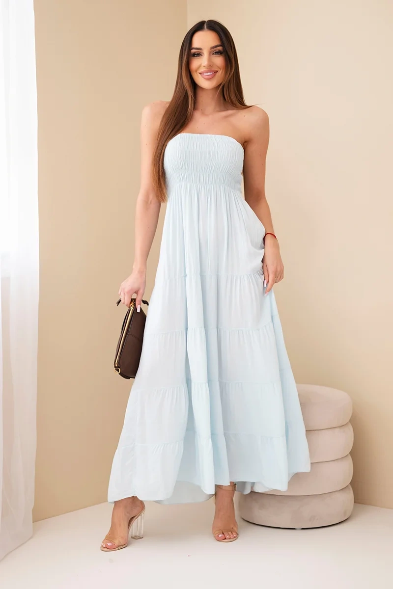 Sukienka damska wiskozowa z elastyczną górą niebieska Ta sukienka damska maxi to idealna propozycja na cieplejsze dni – zachwyca lekkością, kobiecym fasonem i wygodą noszenia. Dzięki elastycznej, marszczonej górze pięknie dopasowuje się do sylwetki, podkreślając talię i biust, a rozkloszowany dół nadaje całości lekkości i swobody. Uszyta w 100% z przewiewnej wiskozy, zapewnia komfort przez cały dzień – niezależnie czy wybierzesz ją na spacer, wakacje czy spotkanie ze znajomymi. Model jest niezwykle kobiecy i uniwersalny – świetnie sprawdzi się zarówno solo, jak i w zestawieniu z jeansową kurtką czy sandałami. Delikatne marszczenia dodają jej uroku i sprawiają, że prezentuje się wyjątkowo efektownie. Rozmiar jest uniwersalny i będzie odpowiedni dla Pań w rozmiarze S, M lub L.