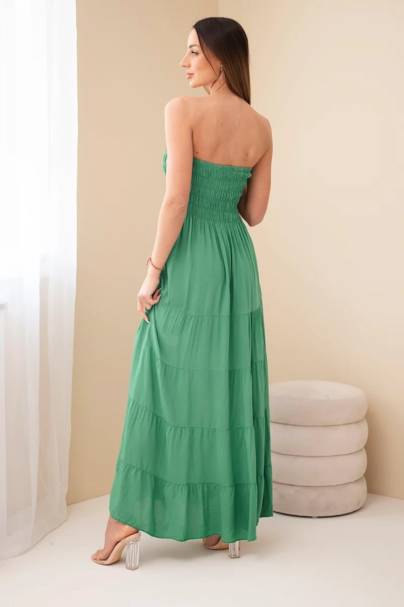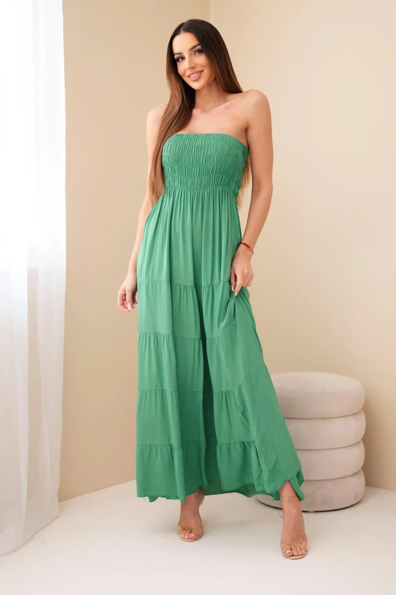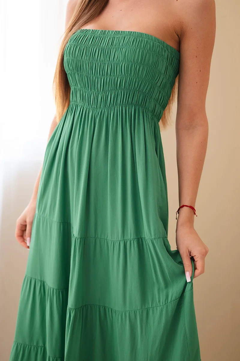 Sukienka damska wiskozowa z elastyczną górą zielona Ta sukienka damska maxi to idealna propozycja na cieplejsze dni – zachwyca lekkością, kobiecym fasonem i wygodą noszenia. Dzięki elastycznej, marszczonej górze pięknie dopasowuje się do sylwetki, podkreślając talię i biust, a rozkloszowany dół nadaje całości lekkości i swobody. Uszyta w 100% z przewiewnej wiskozy, zapewnia komfort przez cały dzień – niezależnie czy wybierzesz ją na spacer, wakacje czy spotkanie ze znajomymi. Model jest niezwykle kobiecy i uniwersalny – świetnie sprawdzi się zarówno solo, jak i w zestawieniu z jeansową kurtką czy sandałami. Delikatne marszczenia dodają jej uroku i sprawiają, że prezentuje się wyjątkowo efektownie. Rozmiar jest uniwersalny i będzie odpowiedni dla Pań w rozmiarze S, M lub L.