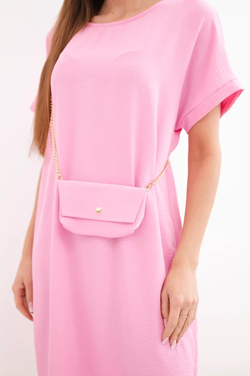 Sukienka damska z krótkim rękawem i torebką na łańcuszku cukierkowy róż Sukienka damska z krótkim rękawem to idealna propozycja dla kobiet ceniących wygodę oraz modny, minimalistyczny styl. Luźny fason sprawia, że sukienka doskonale układa się na sylwetce, zapewniając pełną swobodę ruchów i komfort noszenia przez cały dzień. Dołączona stylowa torebka na łańcuszku stanowi praktyczny i modny dodatek, który podkreśla charakter całej stylizacji.