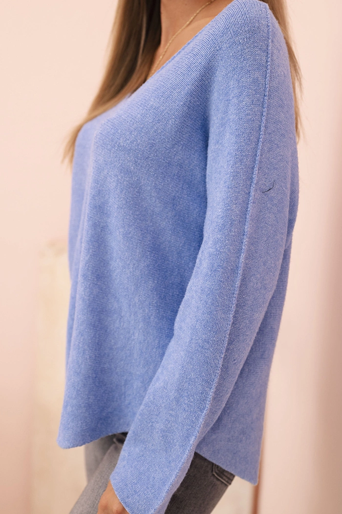 Sweter damska z wiskozą z dekoltem w serek błękitny Stylowy sweter damska z wiskozą to świetna propozycja na chłodniejsze dni. Wykonany z przyjemnej w dotyku, elastycznej dzianiny, zapewnia komfort noszenia przez cały dzień. Klasyczny fason z dekoltem w serek subtelnie podkreśla szyję i sprawia, że sweter doskonale komponuje się zarówno ze spodniami, jak i spódnicą.