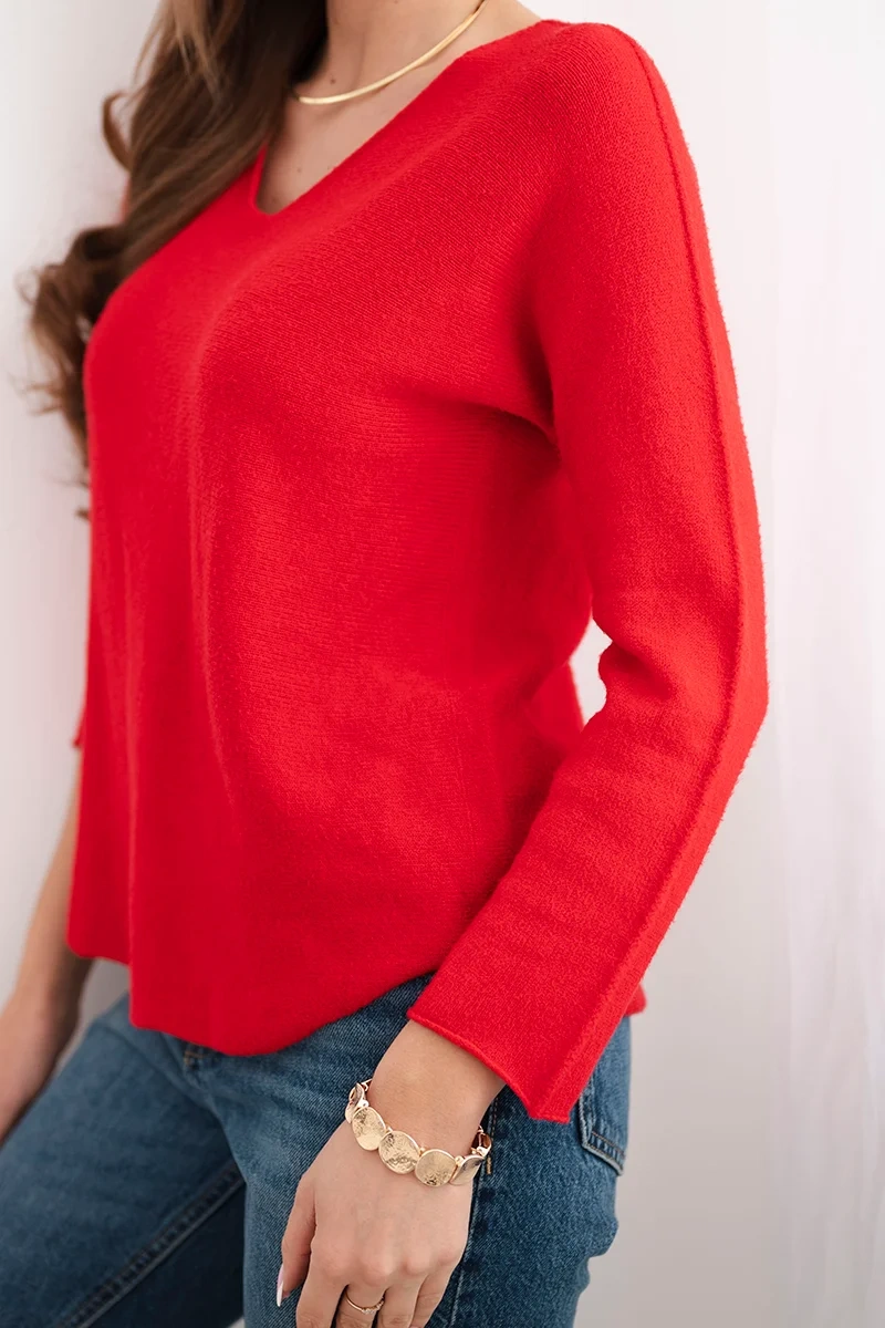 Sweter damska z wiskozą z dekoltem w serek czerwony Stylowy sweter damska z wiskozą to świetna propozycja na chłodniejsze dni. Wykonany z przyjemnej w dotyku, elastycznej dzianiny, zapewnia komfort noszenia przez cały dzień. Klasyczny fason z dekoltem w serek subtelnie podkreśla szyję i sprawia, że sweter doskonale komponuje się zarówno ze spodniami, jak i spódnicą.