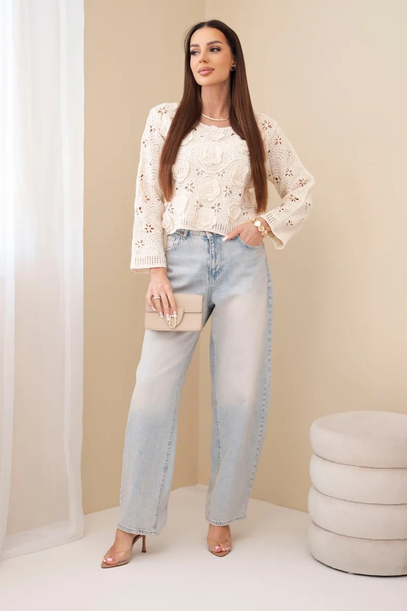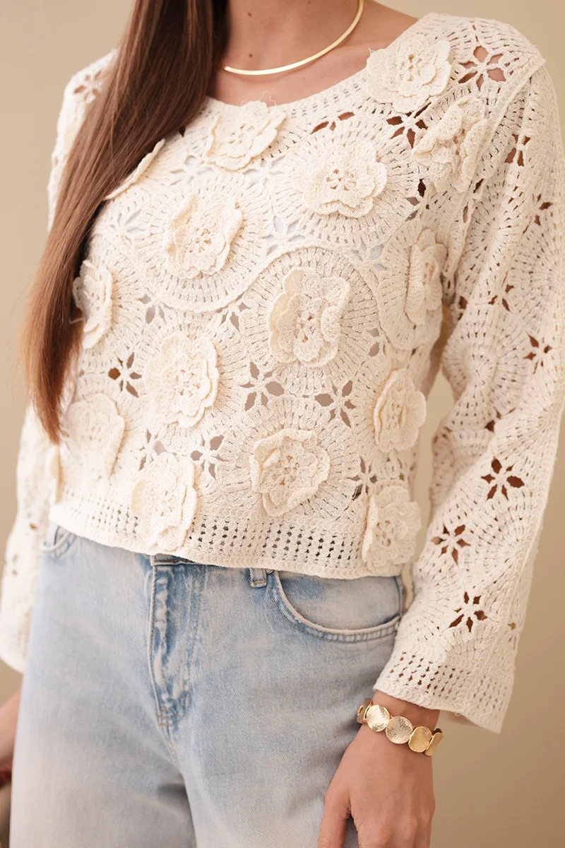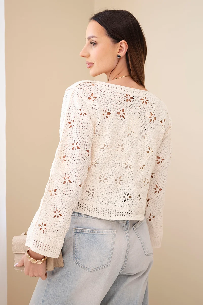 Sweter damski ażurowy z kwiatowym wzorem beżowy Stylowy sweter damski o wyjątkowym, ażurowym splocie to doskonała propozycja dla kobiet ceniących oryginalny design i wygodę. Model wyróżnia się efektownym, rękodzielniczym wzorem z motywem kwiatowym, który nadaje całości romantycznego i modnego charakteru. Dzięki lekkiej, przewiewnej strukturze świetnie sprawdzi się w sezonie przejściowym – wiosną oraz jesienią, a także podczas chłodniejszych letnich wieczorów.