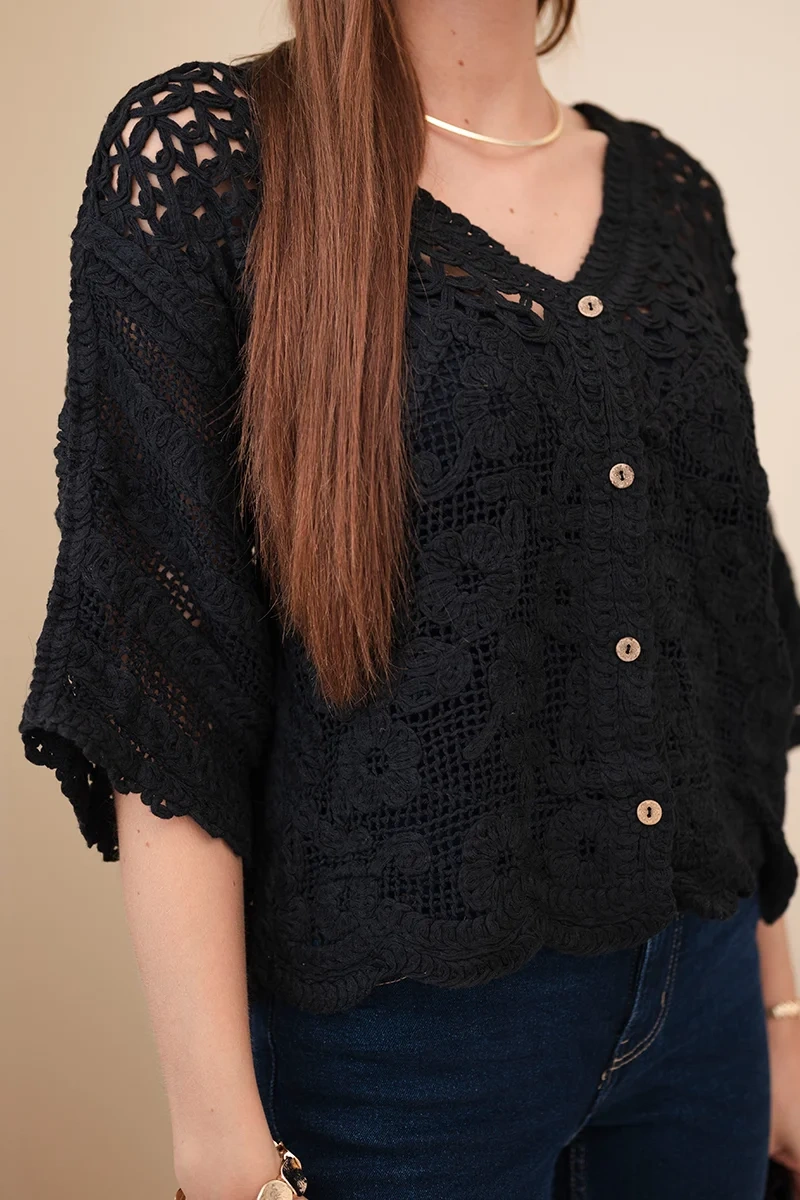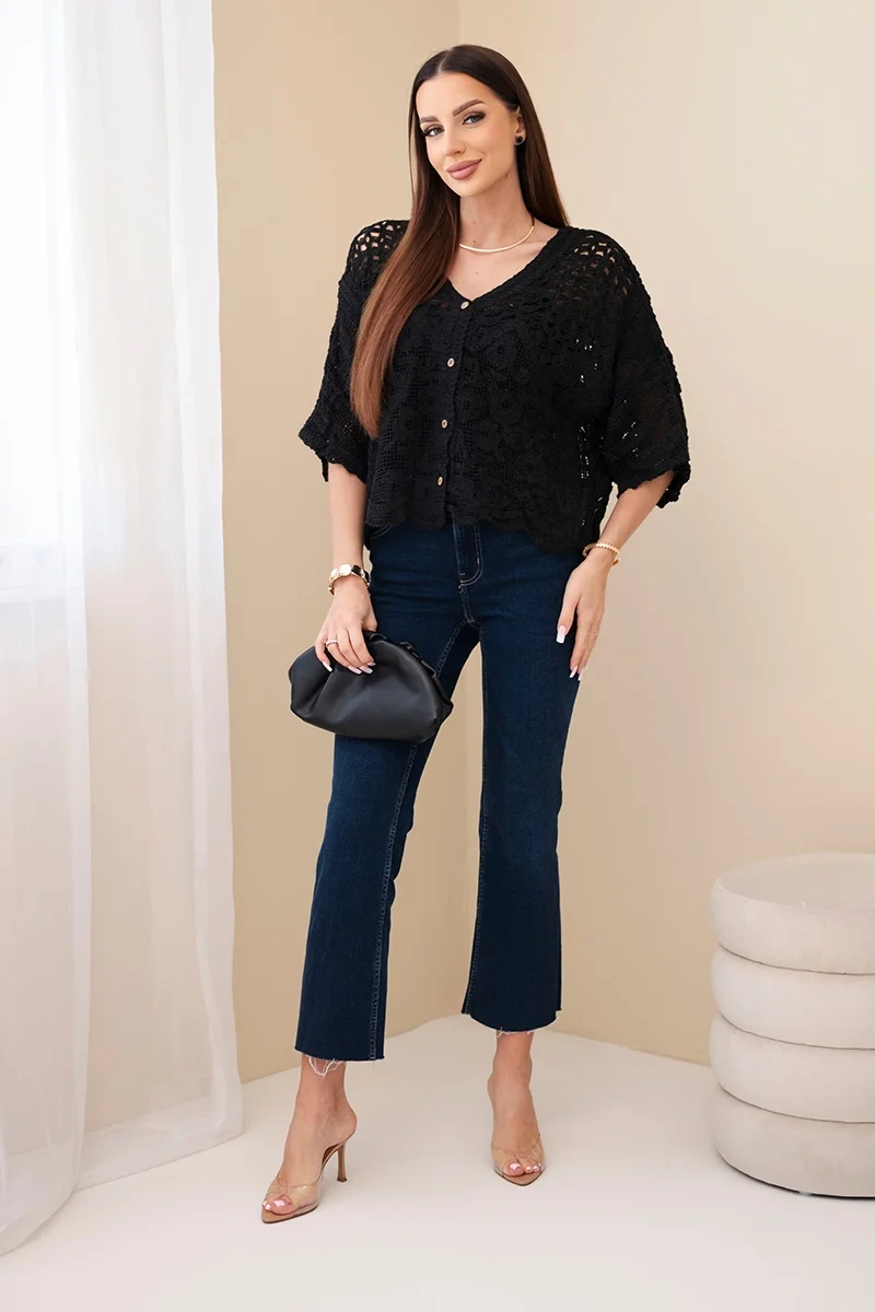 Sweter damski zapinany jest na guziki, co sprawia, że jest bardzo funkcjonalny i łatwy w stylizacji. Można nosić go zarówno jako klasyczny element garderoby, jak i lekką narzutkę na top lub sukienkę. Krótszy fason oraz luźniejszy krój sprawiają, że doskonale układa się na sylwetce, podkreślając jej atuty i zapewniając swobodę ruchów. Krótki rękaw nadaje mu lekkości i sprawia, że świetnie sprawdzi się w stylizacjach wiosennych oraz letnich.