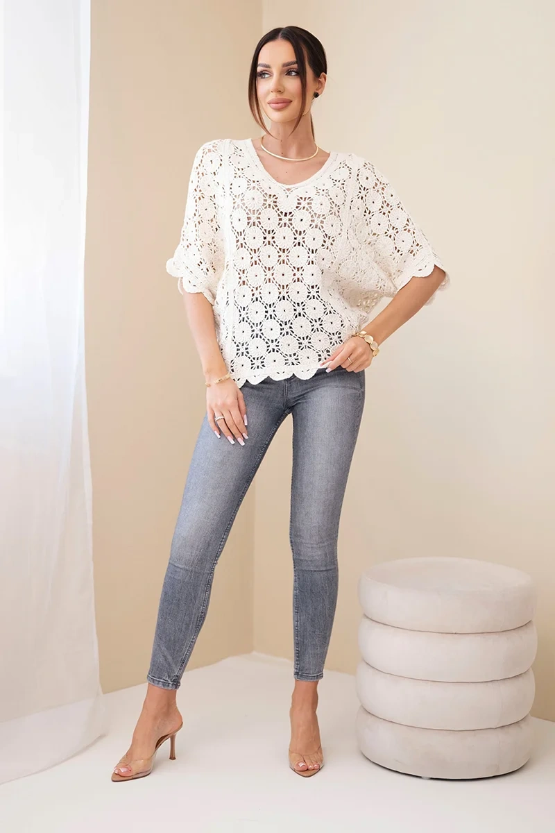Modny sweter damski bawełniany o kroju oversize to doskonała propozycja dla kobiet, które cenią wygodę oraz stylowy, swobodny wygląd. Model wyróżnia się efektownym ażurowym wzorem o dekoracyjnym splocie, który nadaje całości lekkości i subtelnego charakteru. Dzięki temu sweter świetnie sprawdzi się w cieplejsze dni jako element casualowych i letnich stylizacji.