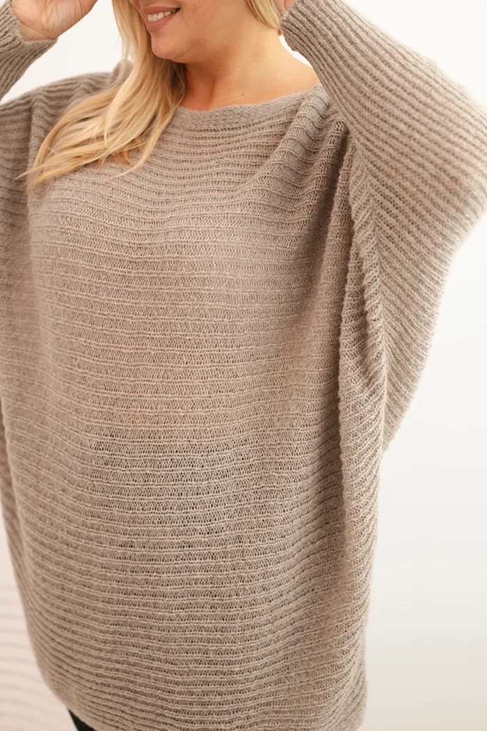 Sweter damski Plus Size z moherem ponczo fango Stylowy sweter damski Plus Size z moherem w formie poncza to doskonała propozycja dla kobiet ceniących wygodę, ciepło i nowoczesny wygląd. Luźny, oversize’owy fason pięknie układa się na sylwetce, zapewniając komfort i swobodę ruchów. Długość zakrywająca biodra sprawia, że sweter idealnie pasuje zarówno do legginsów, jak i jeansów, tworząc modne i wygodne stylizacje na co dzień.